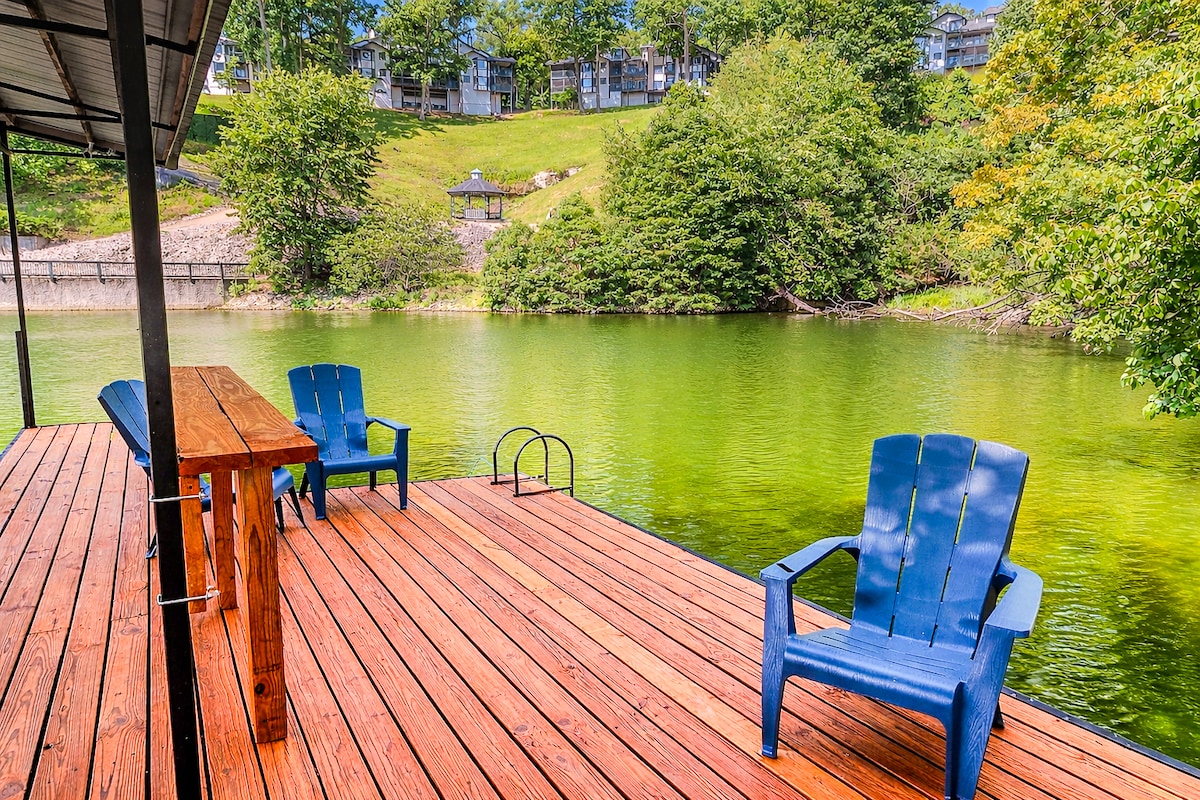 Entire lake house ready for your next lake retreat with family or friends. Spacious living area including outdoor deck space with a private dock and kayaks for use! Watch the sunset on the dock while grilling out or next to the gas fire pit. Cozy up next to the wood burning fireplace. **NEW LOWE Tritoon BOAT RENTAL option or space to side dock your boat. Close to the strip, grocery stores, and restaurants. Mini golf, go-karts, and a winery are also nearby. Perfect for a weekend or long get away.