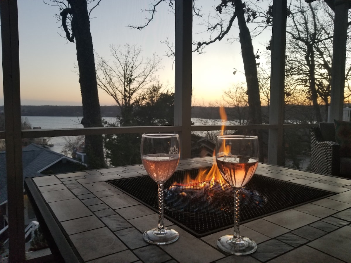 Sit by the fire & relax while enjoying views of Lake of the Ozarks. Nestled in the beautiful Tan-Tar-A Estates/Margaritaville-resort, our 2 bed/2 bath lake house is great for couples or a small family. Fully stocked kitchen w/updated appliances, 65" TV in family room and TV's in both bedrooms. Covered front porch and BBQ grill. Nearby amenities (for additional fee) will keep you busy w/ seasonal pools, golf courses, indoor waterpark, golf, horseback riding, marina, fishing, hiking and more!