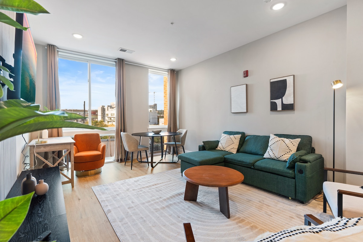 Nestled in Fishtown Urby, this 1 BD apartment offers a tranquil view of the lush courtyard through north-facing windows. The spacious bedroom is designed for ultimate relaxation, featuring an interior layout that’s ideal for light-sensitive guests. The apartment is furnished with a clean, contemporary style that maintains a cozy atmosphere. Enjoy a fully-equipped kitchen with updated appliances, cookware, and utensils and a living area that is outfitted with a Sonos speaker and a smart TV.