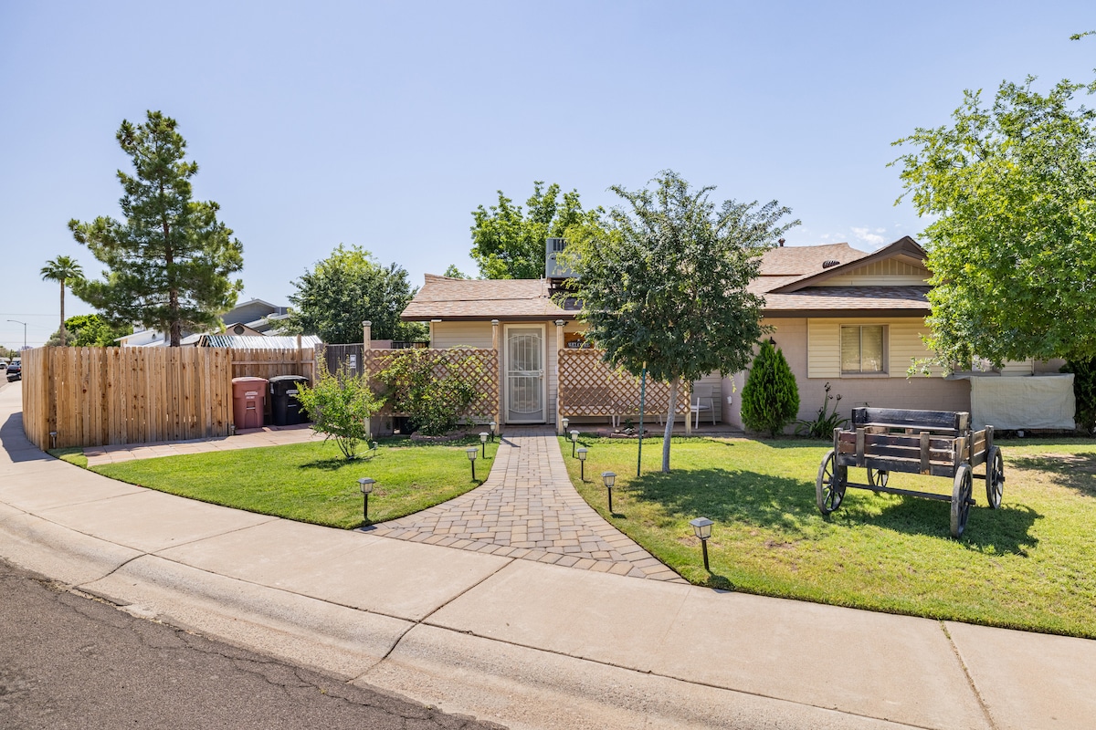Cozy studio. Queen bed & roll away if needed, 3/4 bath, micro., 42" flat tv with Prime Video. WiFi. Priv. entrance. Centrally located. Close to what brings people in the first place! 5 mins. from Talking Stick Resort/Casino & Salt River Fields. 10 mins. from Westworld. Close to dwntwn, golf tourneys, classic car auctions & shows, water park. Quiet neighborhood, quick access to the SR 101 fwy. Peace/quiet assured! PLEASE READ ENTIRE LISTING, INCLUDING HOUSE RULES before booking so no surprises.
