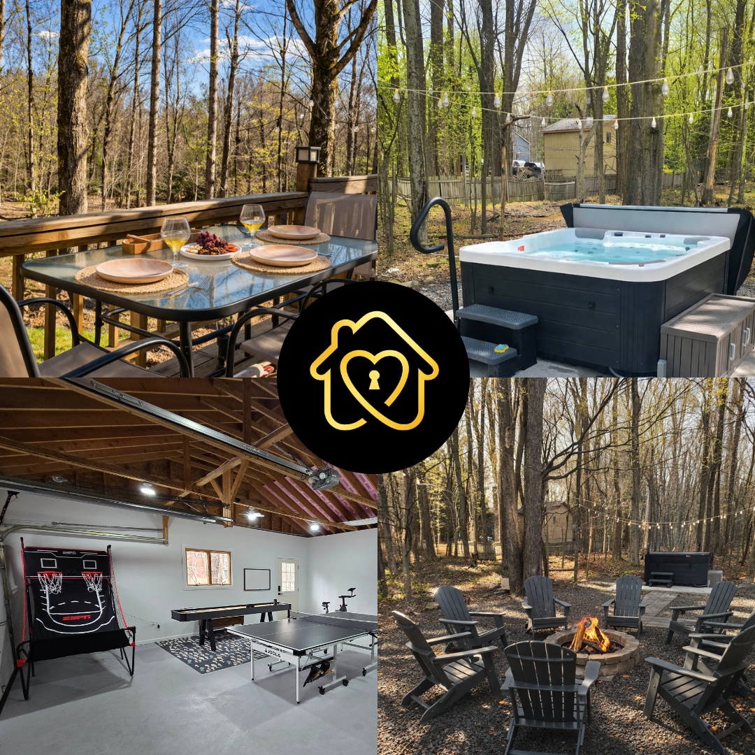 Immerse yourselves in the perfect blend of serenity and romance at our fully renovated Poconos log cabin. It offers a private feel, while located in a safe neighborhood. Cuddle up in our living room day bed while enjoying backyard forest views through the giant picture window. Relax in the hot tub or by the fire pit where memories are made! Centrally located, the cabin provides access to ski resorts and hiking trails. As guests, you'll also enjoy access to the lake, pool, and sports courts.