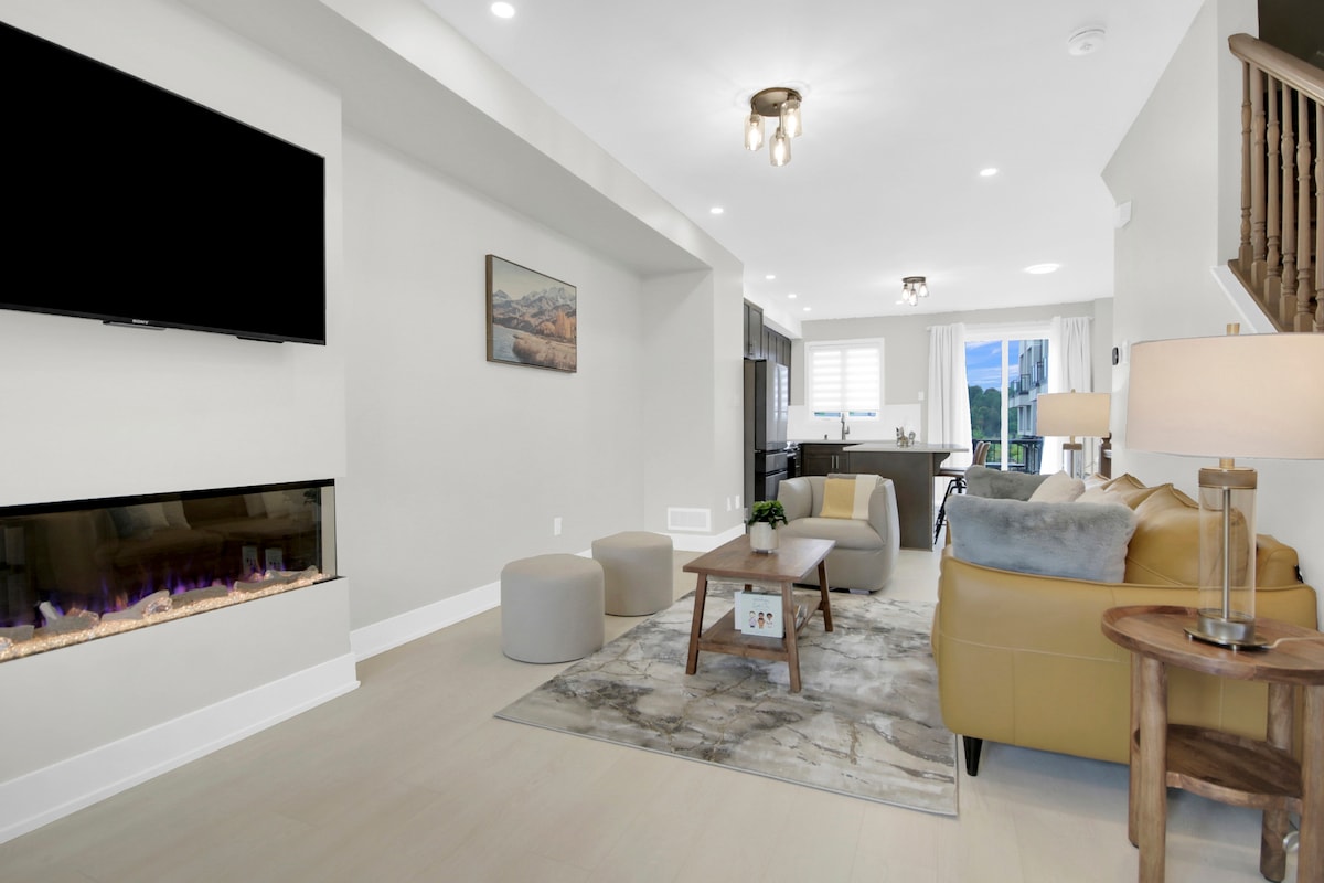 Less than 14 minutes away from Downtown Ottawa, this newly built 2021 modern and open concept townhome comfortably accommodates large groups. It is close to many amenities such as Movati, Landmark Cinemas, Walmart, Canadian Tire, Moxies, Lonestar, and much more. This home includes 8 beds, 4 bedrooms, 3.5 bathrooms, a large breakfast bar area, a private office space, 10ft ceilings across the main floor, a warm and modern living and dinning room area, new washer and dryer, and much more.