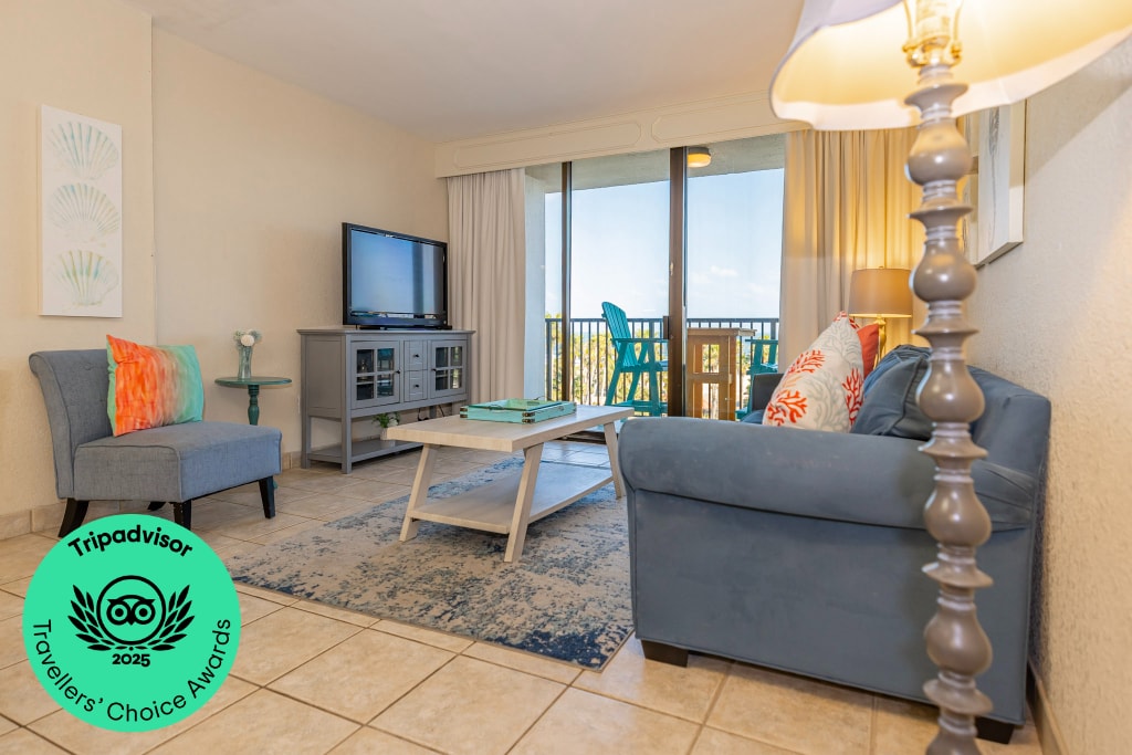 The Isla Grand Beach Resort condo features views of our pools, along with beach views. Condo #304 rooms accommodate up to 6-ppl with 1-king bed, and 2 twin beds in the second unit, and a sofa sleeper in the living room Our Condo unit Features: 2 Balconies 3 Televisions with 74- Spectrum channels Sleeper Sofas in selective rooms (included) Iron and Ironing Board Hairdryer Full size refrigerator Full size kitchen Free Wireless Internet Digital In-Room Safe at this cheerful getaway.
