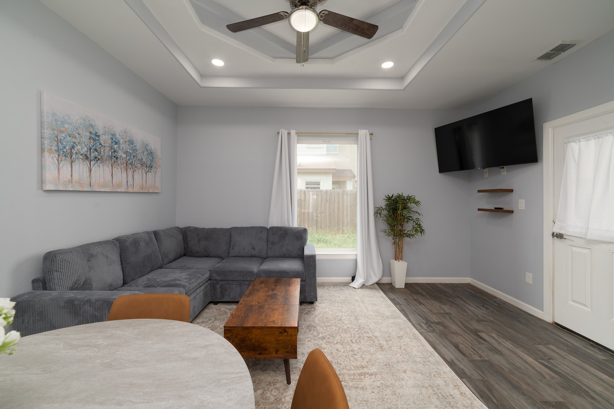 Experience comfort & convenience at this beautiful townhome nestled in a lush golfing community. This modern space features 2 bedrooms, with additional sleeping options, 2 queen air mattresses & a couch. Enjoy reliable Wi-Fi, keyless entry, & 3 Smart TVs with access to Netflix, Hulu, & Prime. Upstairs, a queen & full bed, a walk-in shower & ample closet space. Downstairs, a cozy living room, a fully equipped kitchen, 1/2 bath & washer/dryer. Guests can also access the community pool and gym.