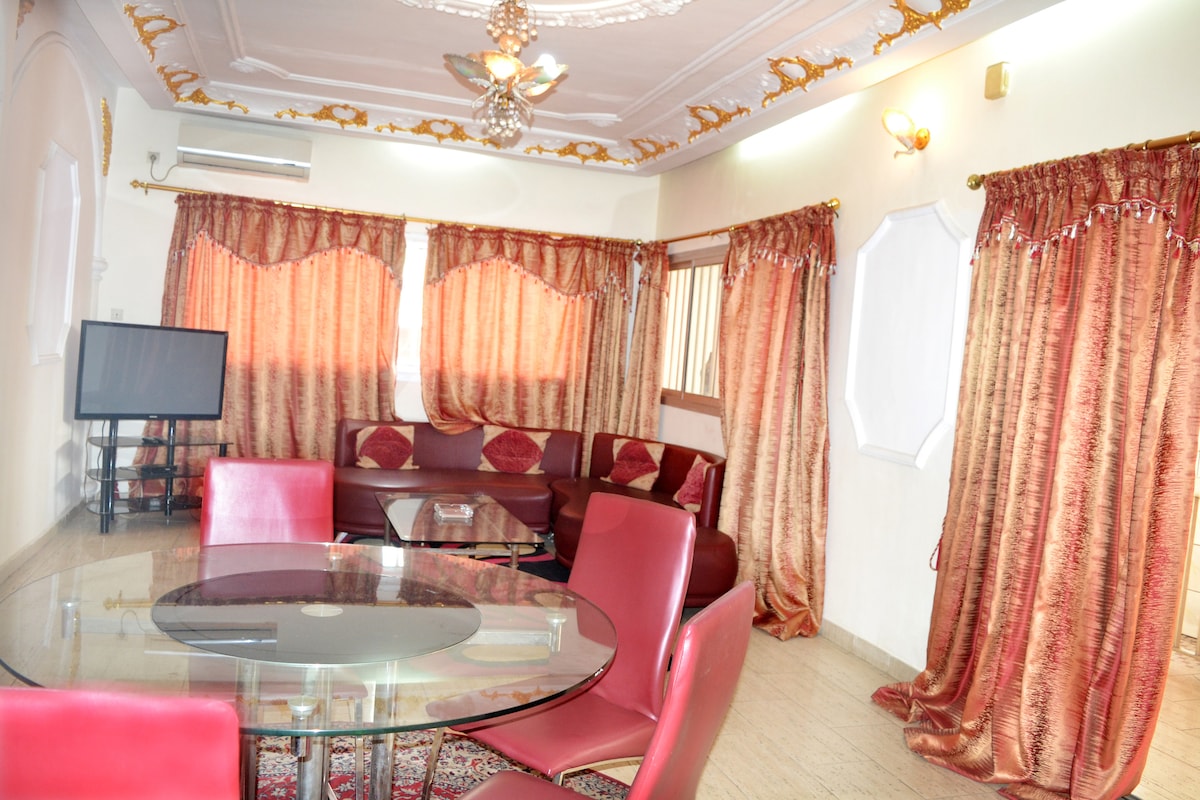 This apartment located in a heart of one of a high standing city in Yaounde, here you will find all commodities around and easy to access . This fully furnished apartment has a big parking with cameras.