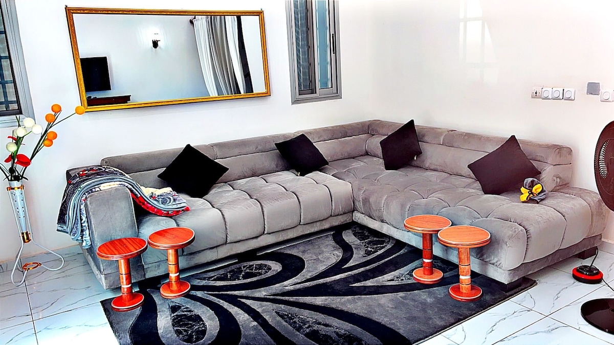 There is a set of leader chairs in the sitting room. The curtains have a transparent lining with good lace. The lighting is bright for reading The ceiling is a shinning lam-brine design and the wall painting is bright cream white oil paint The apartment is located at the base of a hilly landscape with attractive rocks and a water fall located some 1.5km away. There is a weekly sales of cattle about 500m from the apartment. One can view about 1/3 cross section of the town from this point.