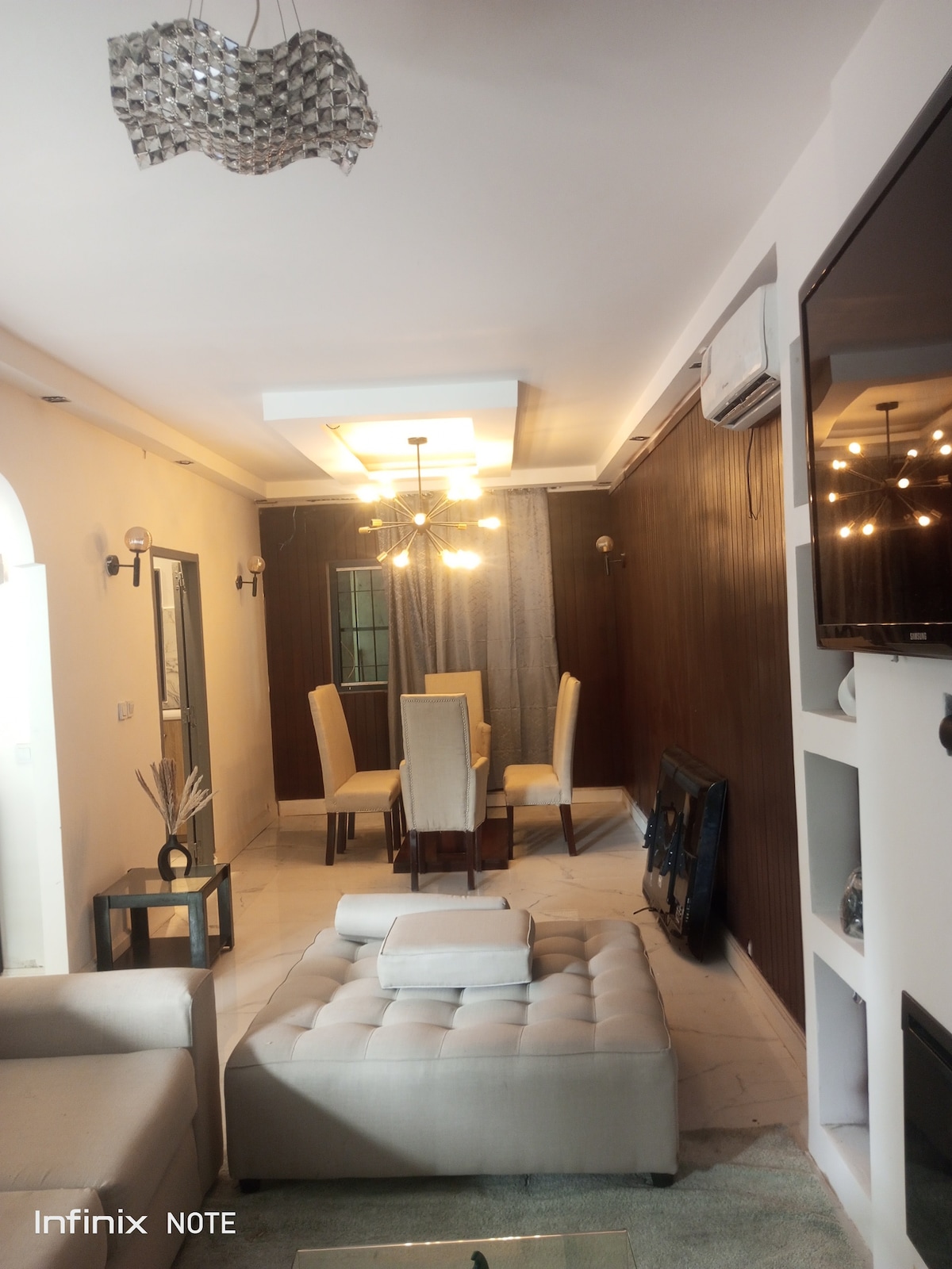 There is a set of leader chairs in the sitting room. The curtains have a transparent lining with good lace. The lighting is bright for reading The ceiling is a shinning lam-brine design and the wall painting is bright cream white oil paint The apartment is located at the base of a hilly landscape with attractive rocks and a water fall located some 1.5km away. There is a weekly sales of cattle about 500m from the apartment. One can view about 1/3 cross section of the town from this point.