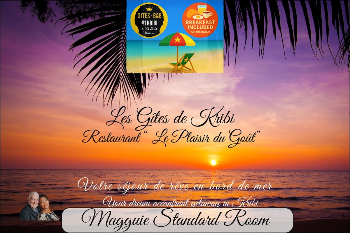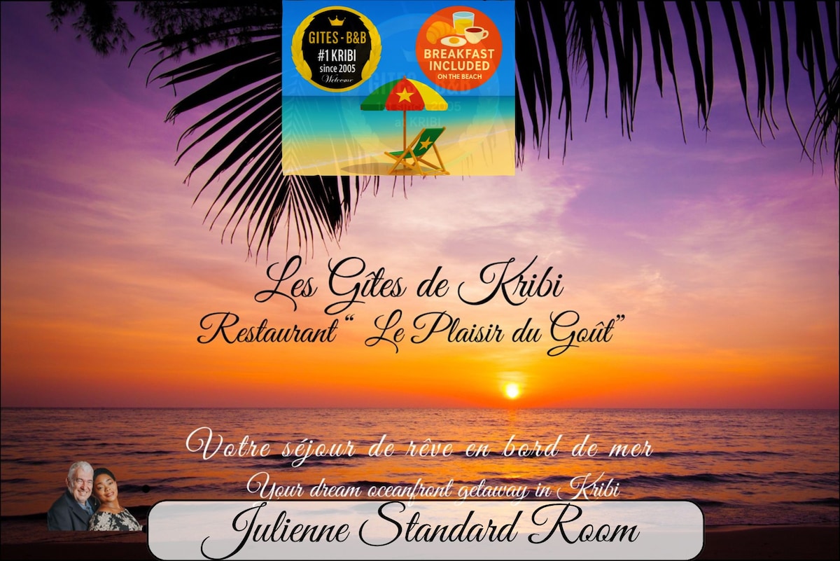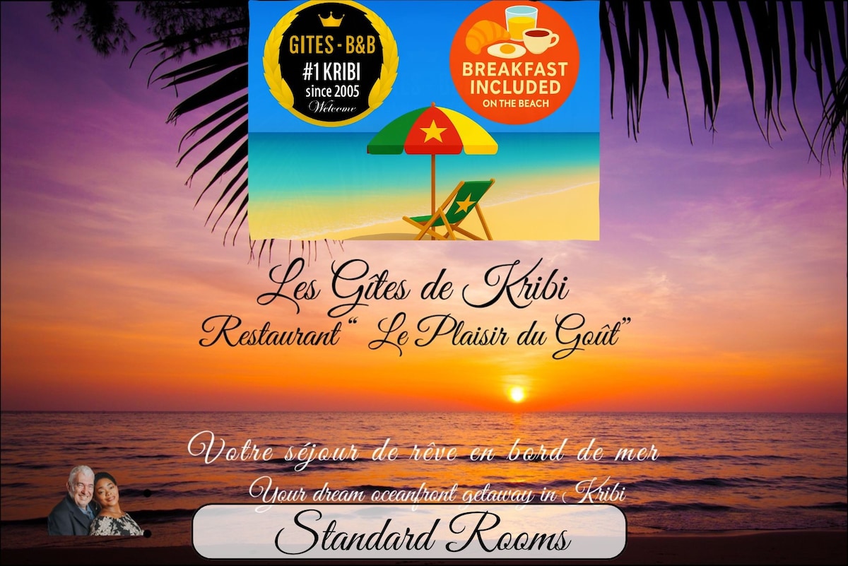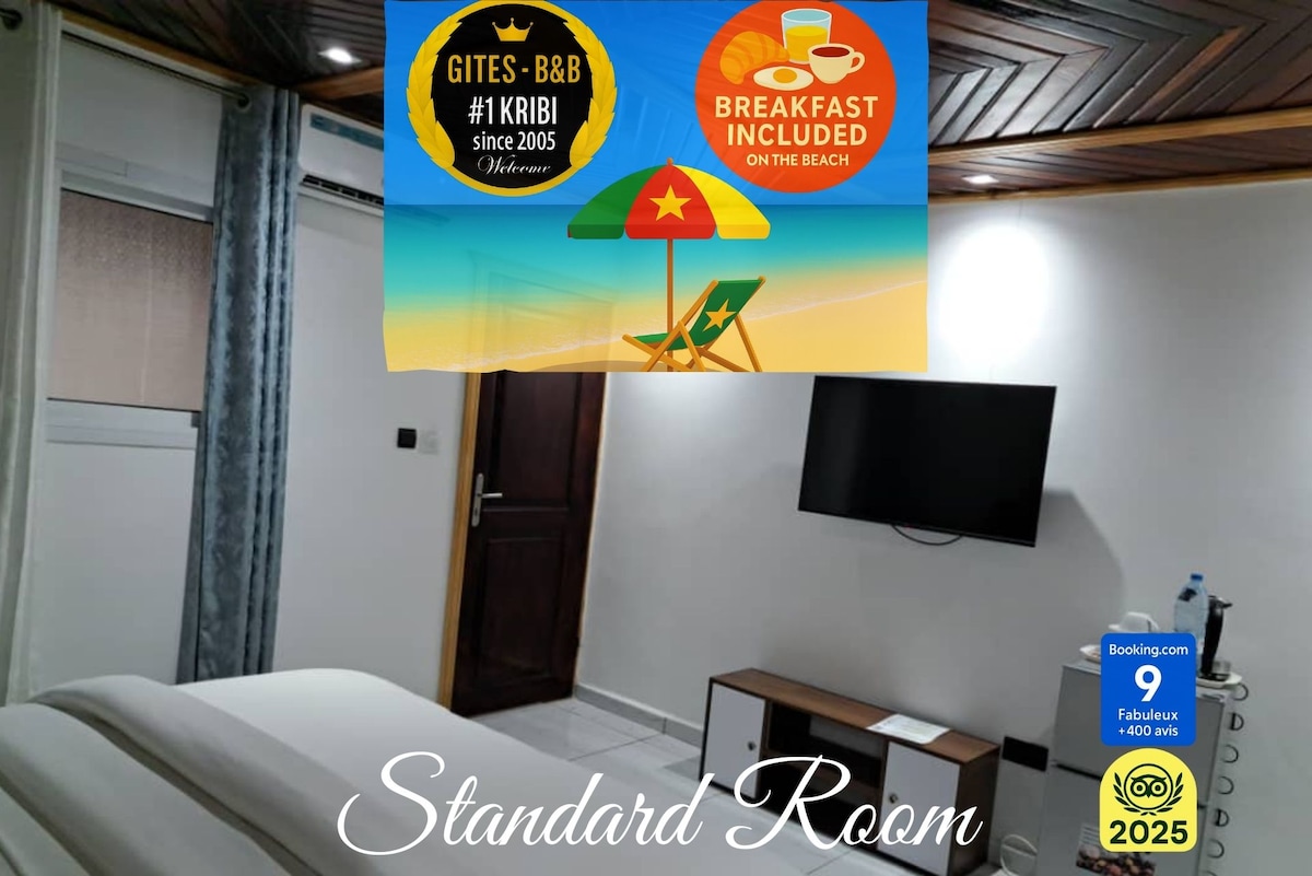 Perfect for a couple's getaway, the Standard rooms combine modern comfort with a tropical ambiance: air conditioning, Wi-Fi, a desk, ample storage, and a private bathroom. Guests have free access to the two swimming pools, the garden and the protected ecological area, the beach within walking distance, and the services of Gîtes de Kribi. Guests also receive a 10% discount at the restaurant "Au Plaisir du Goût," renowned for its seafood cuisine.
