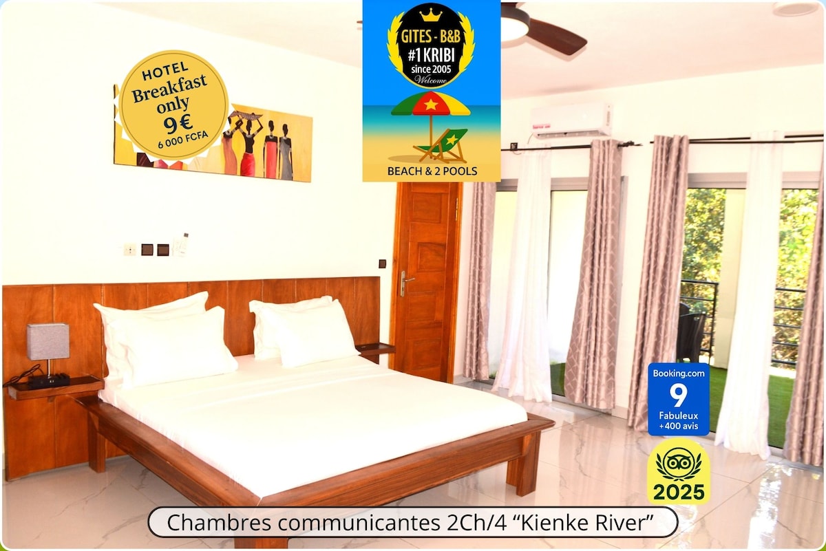 Chambres Communicantes – Lobé, Ntem, Kienje & Dja Idéales pour familles ou amis, nos chambres côte à côte reliées par une porte intérieure offrent confort et intimité à deux pas de la plage. Climatisées, équipées de lits doubles et simples, salle(s) de bain avec douche chaude, TV, Wi-Fi gratuit. Profitez de l’accès piscine, salle de sport et restaurant Au Plaisir du Goût. Un choix pratique et convivial au cœur de Kribi.