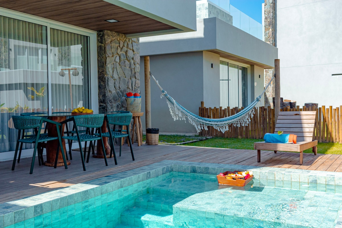 A poucos passos do condomínio, você encontra uma praia paradisíaca e quase exclusiva, com águas cristalinas e piscinas naturais na maré baixa. O imóvel é um apartamento duplex em condomínio à beira-mar, com piscina, academia e solarium. Conta ainda com piscina privativa aquecida com hidromassagem no rooftop, além de chuveiros e colchões de alto padrão. Próximo ao condomínio, há restaurante e bar de praia à beira-mar, perfeito para desfrutar de refeições deliciosas e drinks refrescantes .