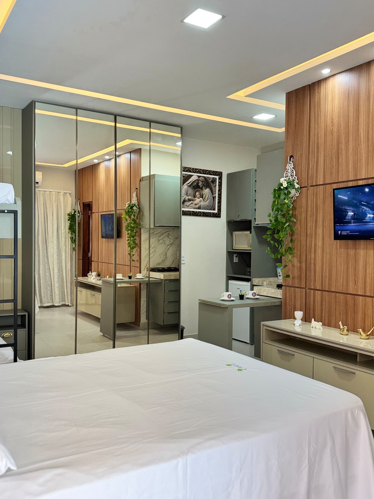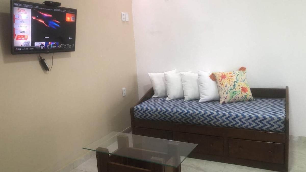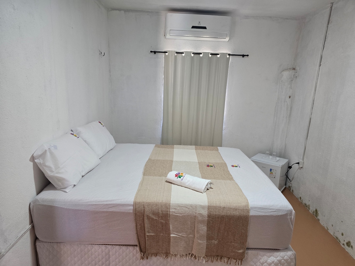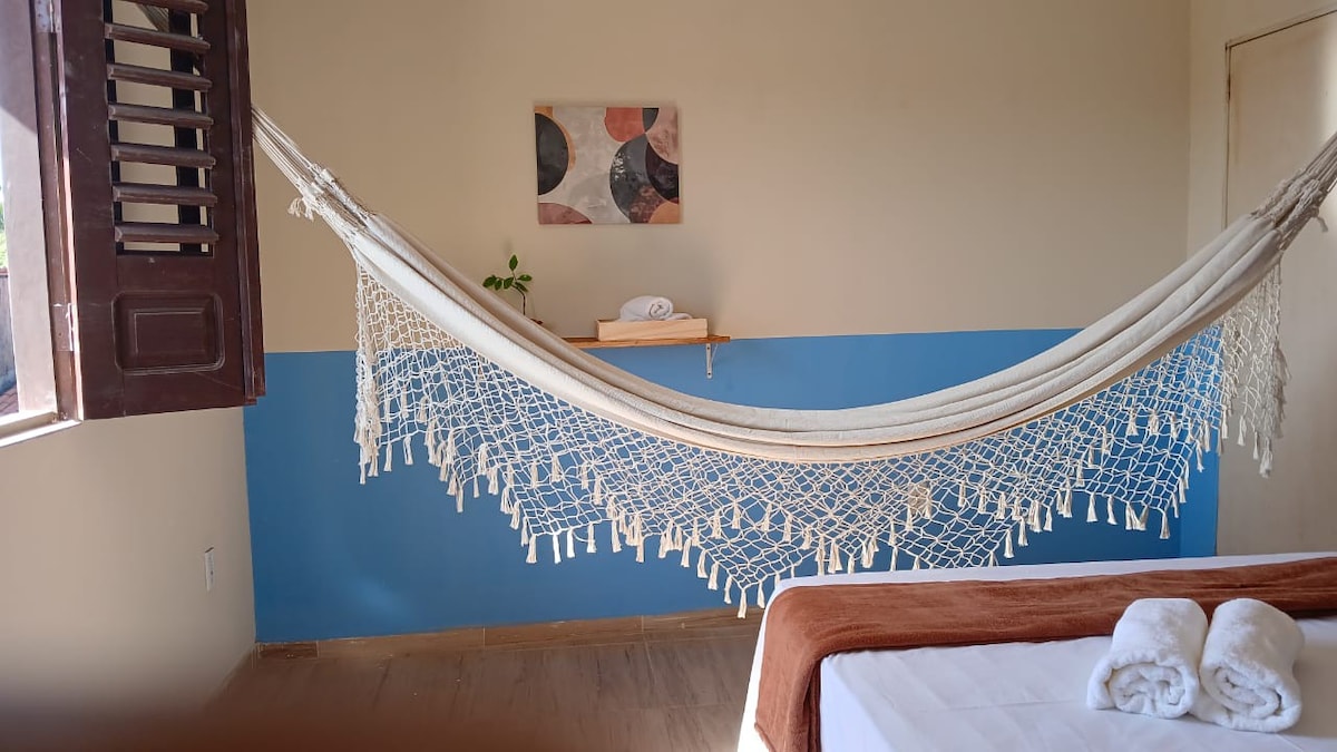 Um espaço tranquilo, próximo a avenida principal. Equipado com geladeira, microondas, wi-fi, louças, armário, mesa, cama de casal, redes, ventilador. Há 12 min da praia, com vários restaurantes na beira mar, com música ao vivo e uma culinária peculiar.