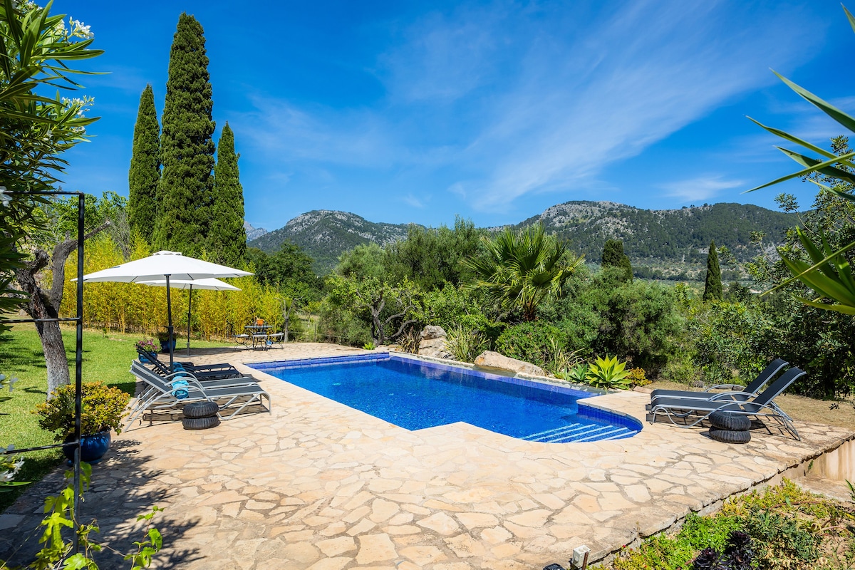 5 bedrooms, 3 bathrooms, kitchen-living, office space in main house. Independent building with en-suite bedroom (only bookings above ten people!). A/C in 5 bedrooms, ceiling fans in living room, kitchen and the smallest bedroom, radiators, 2 fireplaces, 2 Internet (downstairs and upstairs), TV, PS3, 2000sq sunny garden (SW orientation), fruit trees, BBQ, 12x5 pool, awesome views, inside Campanet, 10m walk to center, 20m drive to Muro beach, 10m drive to Pollensa, 35m drive to airport and Palma.