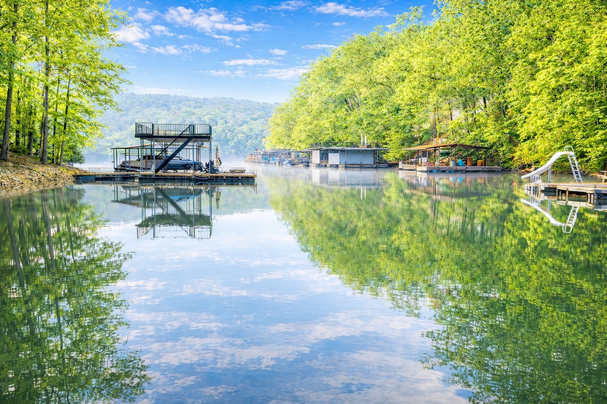 “Lakeside Mesa” on Norris Lake Tennessee will provide all the relaxing fun you could want for you, your friends, and your family. In a secluded cove where you can enjoy the private covered dock, kayaks, two fire pits, two decks, outside covered living/entertaining area, cornhole court, outdoor bar, and enough room for everyone all together. We have two brand new tritoon boats, two 2022 jetskis available for rent and a FREE lithium ion golf cart! Direct ride to sxs trails!