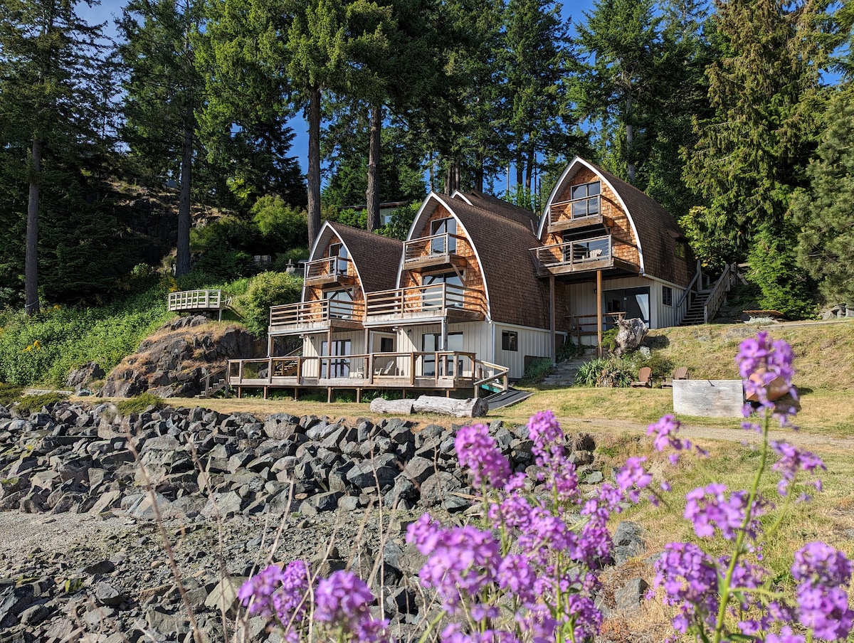 You won’t want to leave this unique oceanfront escape. Nestled in Gowlland Harbour on Quadra Island, Jade Resort offers stunning views and a peaceful retreat. Our 10 hillside suites overlook the water, perfect for relaxing and watching the tides shift. Just minutes from beaches, trails, and Rebecca Spit. Each suite includes a monocular for wildlife spotting. No TVs - intentionally - so you can unplug and enjoy the natural beauty around you.