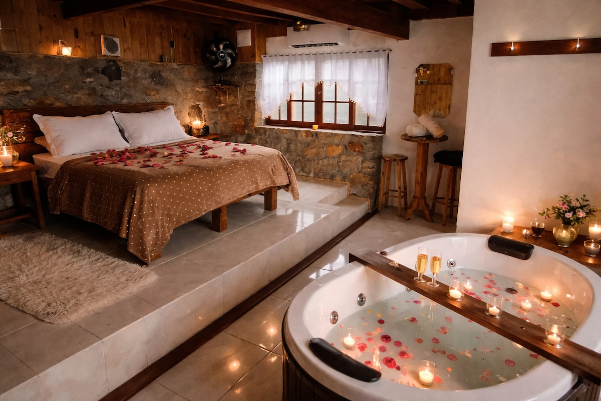 Chalé Céu da Colina – Refúgio com vista da montanha ao mar. Localizado no Sítio Vale Encantado, Palhoça–SC, a 1 km da BR-101, em estrada de chão tranquila. Situado na cobertura da pousada, é ideal para casais e oferece uma vista deslumbrante. Ambientes: hall de entrada, área home integrada, cozinha completa e sacada com balanço. Comodidades: banheira aquecida com vista, roupas de cama e banho, telescópio e lareira externa. Próximo a cachoeira e às principais praias da região sul.
