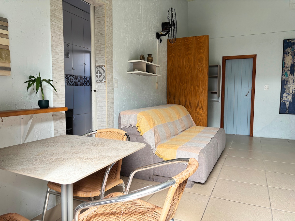 Apartamento studio em condomínio uma quadra mar, 100 metros praia. Em condomínio privado com fechadura digital, segurança 24 hs, piscina, academia e lavanderia. Wi-Fi 500 mega, Tv 55 polegadas . Varanda, quarto, sala, banheiro, cozinha equipada, sala c tv ,ar condicionado. Tem uma vista livre a frente e uma pequena vista do mar. Decorado, compacto e climatizado. Ambiente tranquilo, organizado e calmo. Estacionamento privativo com área coberta. Descanse, desfrute ou faça seu home office.