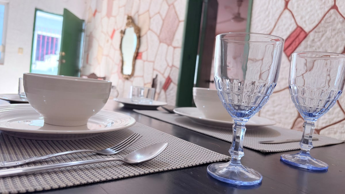 Casa Serena, located in the heart of the city, is a spacious and warm space, with sober tones that provide a visual rest. Mango wood, macrame, natural fibers and original pieces are the perfect mix for a pleasant stay. Two inner courtyards display its green splendor, with palms and magnificent "tiger claws". Walking in the surroundings you can enjoy an afternoon full of color, the evening breeze and magnificent sunsets.