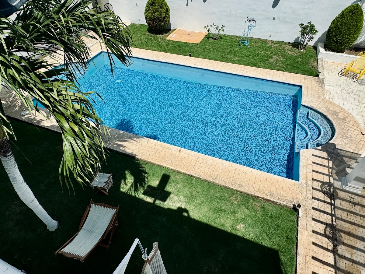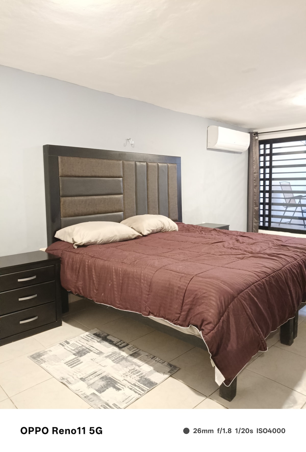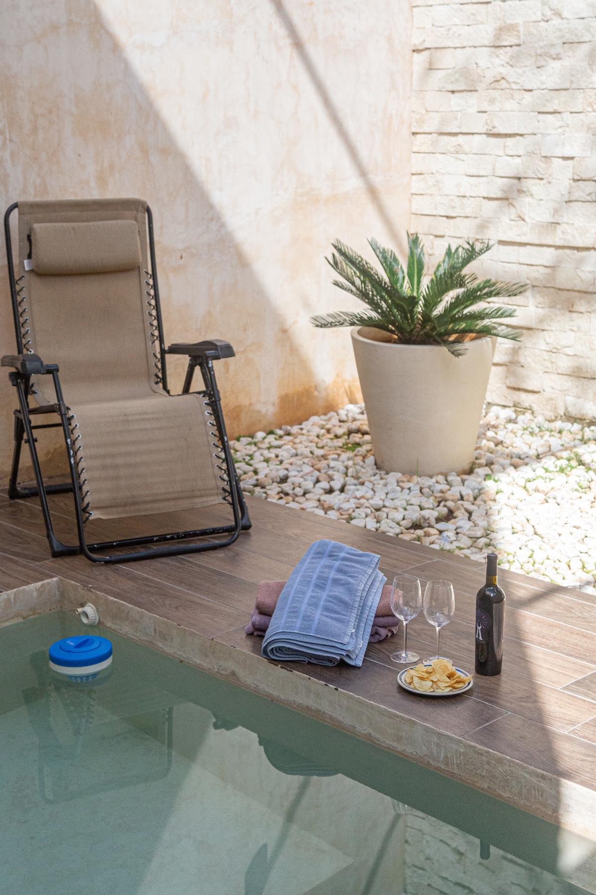 Es un alojamiento completo con alberca privada. Propiedad ubicada a unos pasos de la famosa calle 59, llena de cafés, restaurantes y bares. La decoración es colonial, la sala con sofá, tv de 50" con Netflix, Wi Fi, comedor para 6 personas, cocina con estufa de inducción magnética , refrigerador, horno de microhondas, 1 dormitorio con cama king size, TV de 32”, 1 aire acondicionado, ropero, baño con agua caliente y terraza con alberca. El Aire acondicionado solo hay en la habitación .
