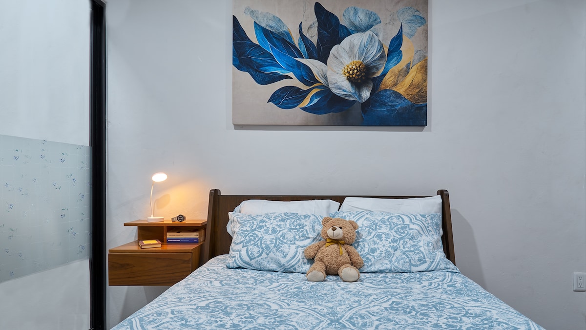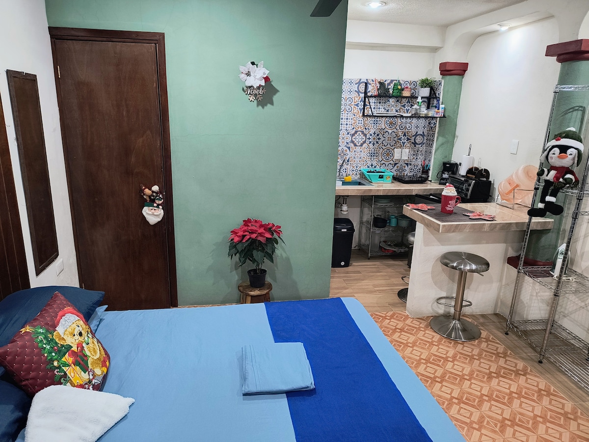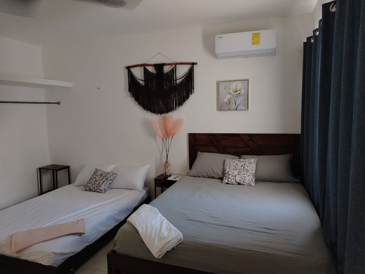 Departamento amplio cómodo con 1 habitación y 2 camas matrimoniales. En la cocina encontraras : parrilla de inducción, freidora, licuadoras, comedor para 4 personas, y una pequeña estancia trasera ideal para relajarse al atardecer o tomar un café por la mañana. La ubicación es excelente, ya que está cerca de supermercados, restaurantes, y transporte público. Sin duda, este departamento es una opción perfecta para quienes buscan un lugar acogedor y bien equipado para su estancia.