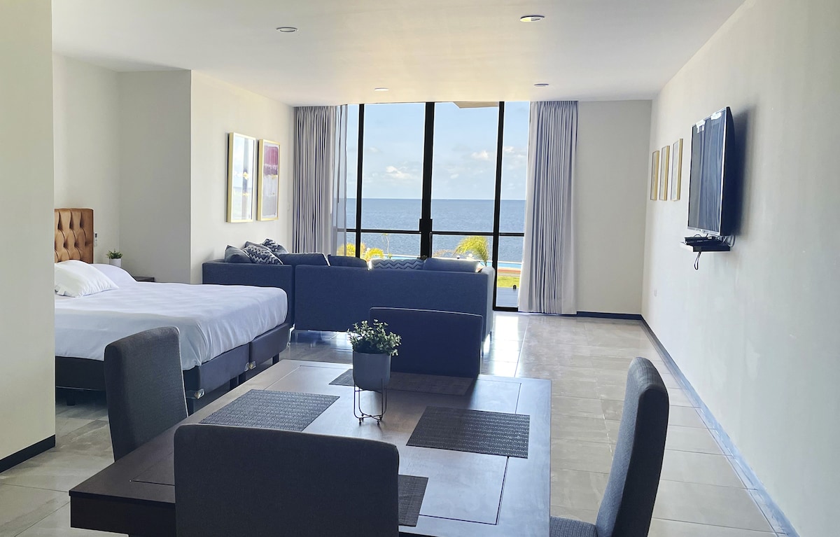 En esta pequeña crujía Sicté se ofrece una estancia para un descanso individual, de pareja o hasta 4 huéspedes y con todos los servicios necesarios, su mezzanine propone el aprovechamiento del espacio y valorar la doble altura de las casas coloniales. Se aprecia áreas que muestran la mampostería o pared de piedra caliza con lo que se estructuraban las casas antiguas. Cuenta con pequeña cocina, desayunador, recamara con cama matrimonial, baño y estancia de tv con un sofá cama tamaño matrimonial.