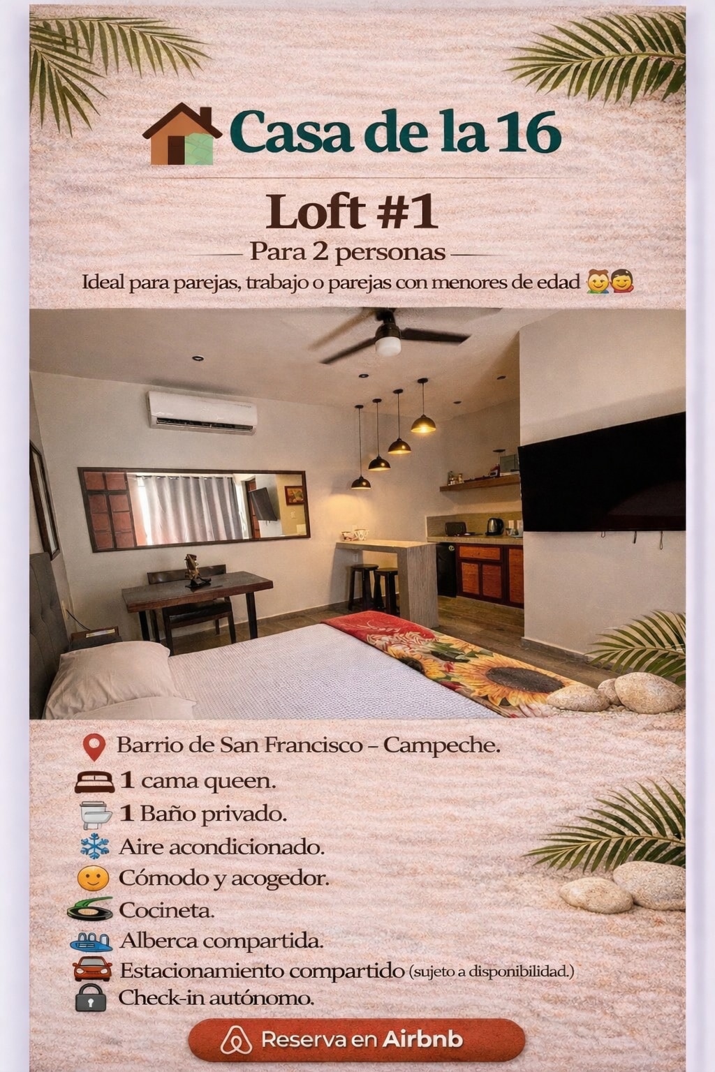 Este acogedor loft es parte del complejo Casa de la 16, con acceso privado y seguro. Alberca y estacionamiento compartidos. Ideal para parejas o viajeros que buscan comodidad y tranquilidad. Ubicado a pocos minutos caminando del Centro Histórico, supermercados, central de abastos, malecón y los Portales de San Francisco. Cuenta con cama queen, baño completo, wifi, Smart TV y cocineta equipada para una estancia práctica y agradable.