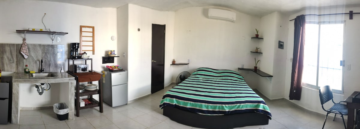 Departamento Privado con Clima Disfruta total privacidad en este espacio con entrada independiente. Cuenta con aire acondicionado, cama matrimonial y ventilador. Para tu entretenimiento, incluye Smart TV con Roku (Netflix y Amazon). Equipado con frigobar, cafetera y tostadora. ¡No salgas al calor! Tenemos un minibar con snacks, refrescos y dulces típicos con costo adicional (pago en efectivo en el lugar). Ideal para disfrutar sin complicaciones. ¡Te esperamos!