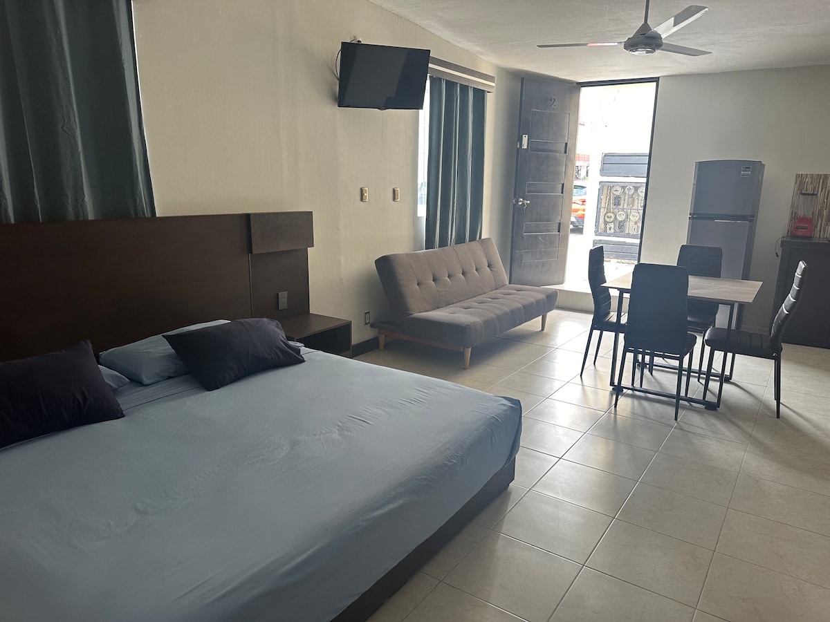 MEJOR OPCION PRECIO CALIDAD CENTRO HISTORICO CAMPECHE Suite de 1 recamara 2 camas individuales a 1 calle del Centro Histórico de la Ciudad, caminando a 5 minutos, estamos ubicados en avenida principal y en barrio tradicional. La Ciudad es Patrimonio Cultural de la Humanidad, titulo otorgado por la UNESCO Cuenta con estancia, comedor, cocina totalmente equipada, un baño, recamara con TV Netflix, PrimeVIDEO, WIFI , AC, seguridad y estacionamiento autos compactos. Baño recién remodelado