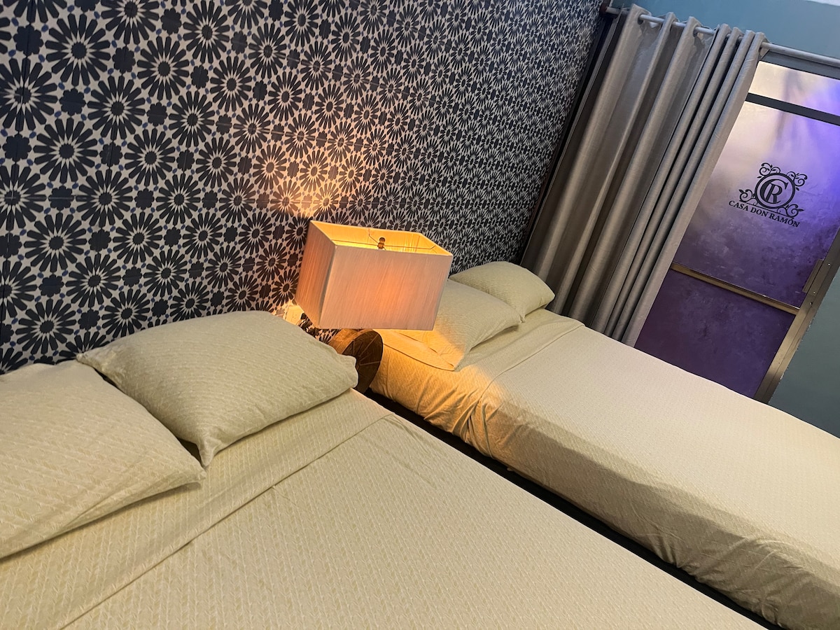 Casa espacio loft, en barrio tradicional a dos cuadras del centro histórico. Es una habitación privada con tres camas individuales y una habitación tipo loft de dos espacios continuos con un total de seis camas. Tiene área de cocina-comedor equipado. Tomar en cuenta que esta opción tiene área de alberca y jacuzzi compartida y no tiene garage, pero se pueden estacionar en los alrededores sin problema.