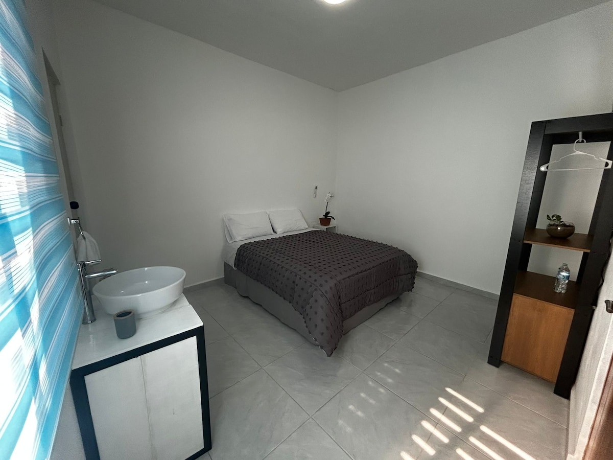 Rodeada de naturaleza, en un ambiente privado y cómodo. La habitación cuenta con estacionamiento privado, jardín, aire acondicionado, café, agua caliente. Y sobre todo un lugar para descansar rodeado de naturaleza. Fácil acceso y muy cerca de los servicios de transporte y alimentos.