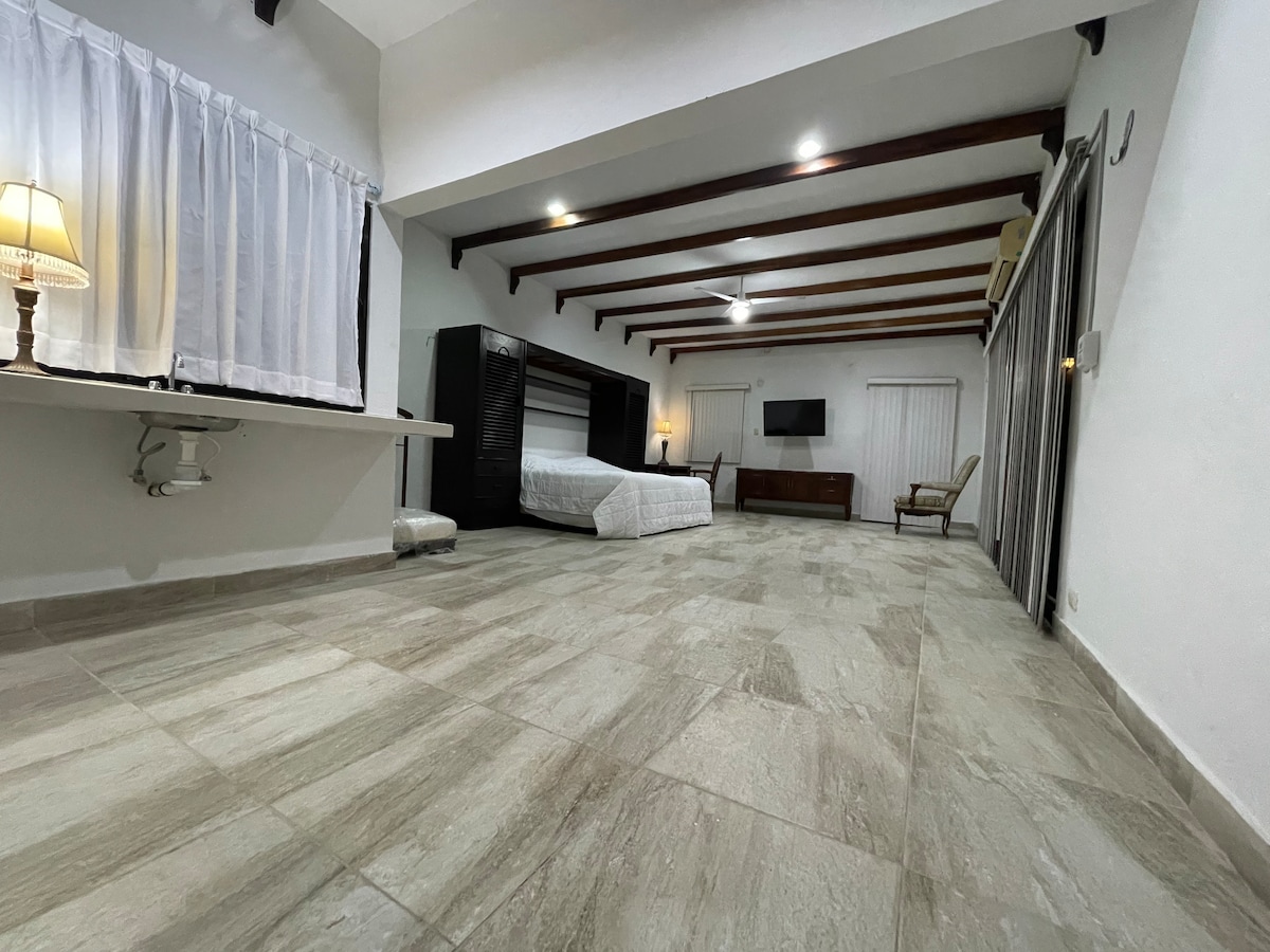 Práctico y acogedor Loft colonial modernizado en el barrio de San Román con cajón de estacionamiento privado a 50 metros del mismo. El loft es climatizado ofrece lo necesario para una estancia comoda, a unos pasos del malecón. Contamos con una cocineta y un pequeño refri para servicios básicos. Si vas a caminar hacia el centro histórico el loft se encuentra a 15 minutos caminando y en auto a 5 minutos, estamos en una esquina por donde pasan autos principalmente durante el día.