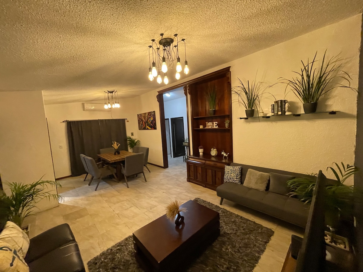 Casa completa de 3 recamaras muy buena ubicación, zona residencial-comercial, cuenta con 3 Habitaciones, 4 camas, p/ hasta 10 huéspedes, 2 baños completos y 2 medio baños, sala con TV Smart de 75 ", comedor para 6 pax, cocina con refrigerador, microonda, estufa y utensilios básicos de cocina; Encontraras un área de lavado con secadora incluida, incluye un GYM doméstico. En esta casa encontrarás un lugar completamente privado y a un precio accesible descubrir todas las maravillas de esta ciudad.