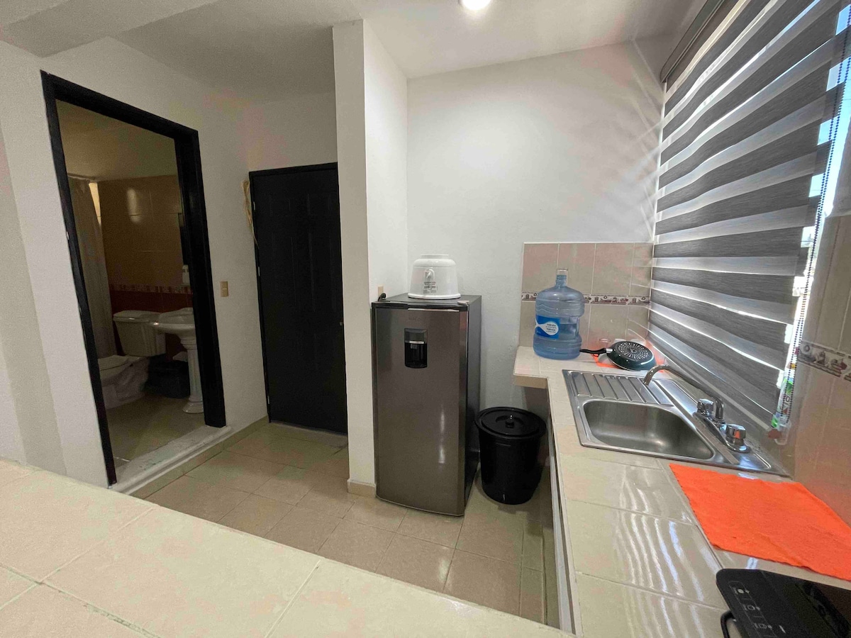 En mi espacio estarás seguro y contarás con todas las amenidades para estar súper cómodo Cocina equipada con los siguientes equipos: horno, licuadora, cafetera, sartenes, lote de trastos, cubiertos, horno microondas, refrigerador Samsung de 3 puertas Una amplia terraza con un comedor de 4 sillas en el exterior con un asador de carnes con una hielera, un sofá cama matrimonial por si acaso. Hay un súper a 50 mts, a la espalda del edificio una Farmacia del Ahorro y a 30 mts el parque central