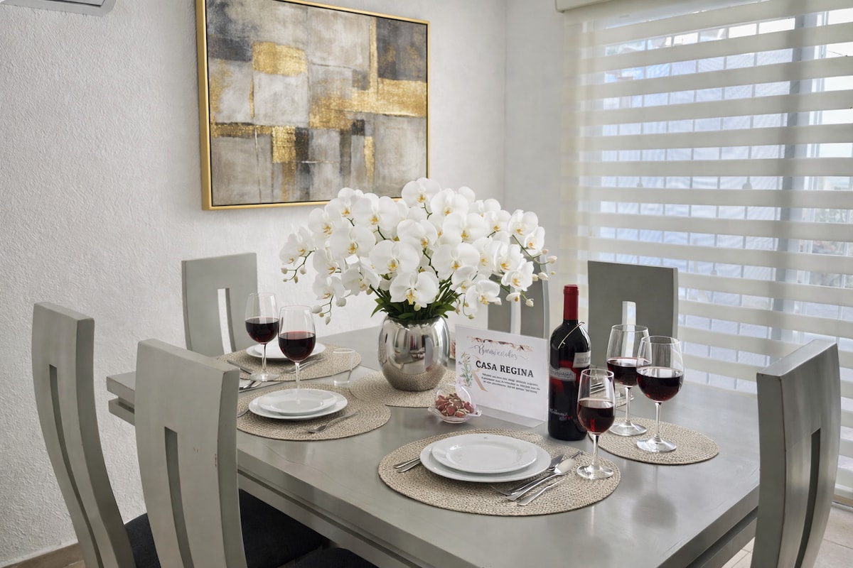 Casa completa de 3 recamaras muy buena ubicación, zona residencial-comercial, cuenta con 3 Habitaciones, 4 camas, p/ hasta 10 huéspedes, 2 baños completos y 2 medio baños, sala con TV Smart de 75 ", comedor para 6 pax, cocina con refrigerador, microonda, estufa y utensilios básicos de cocina; Encontraras un área de lavado con secadora incluida, incluye un GYM doméstico. En esta casa encontrarás un lugar completamente privado y a un precio accesible descubrir todas las maravillas de esta ciudad.