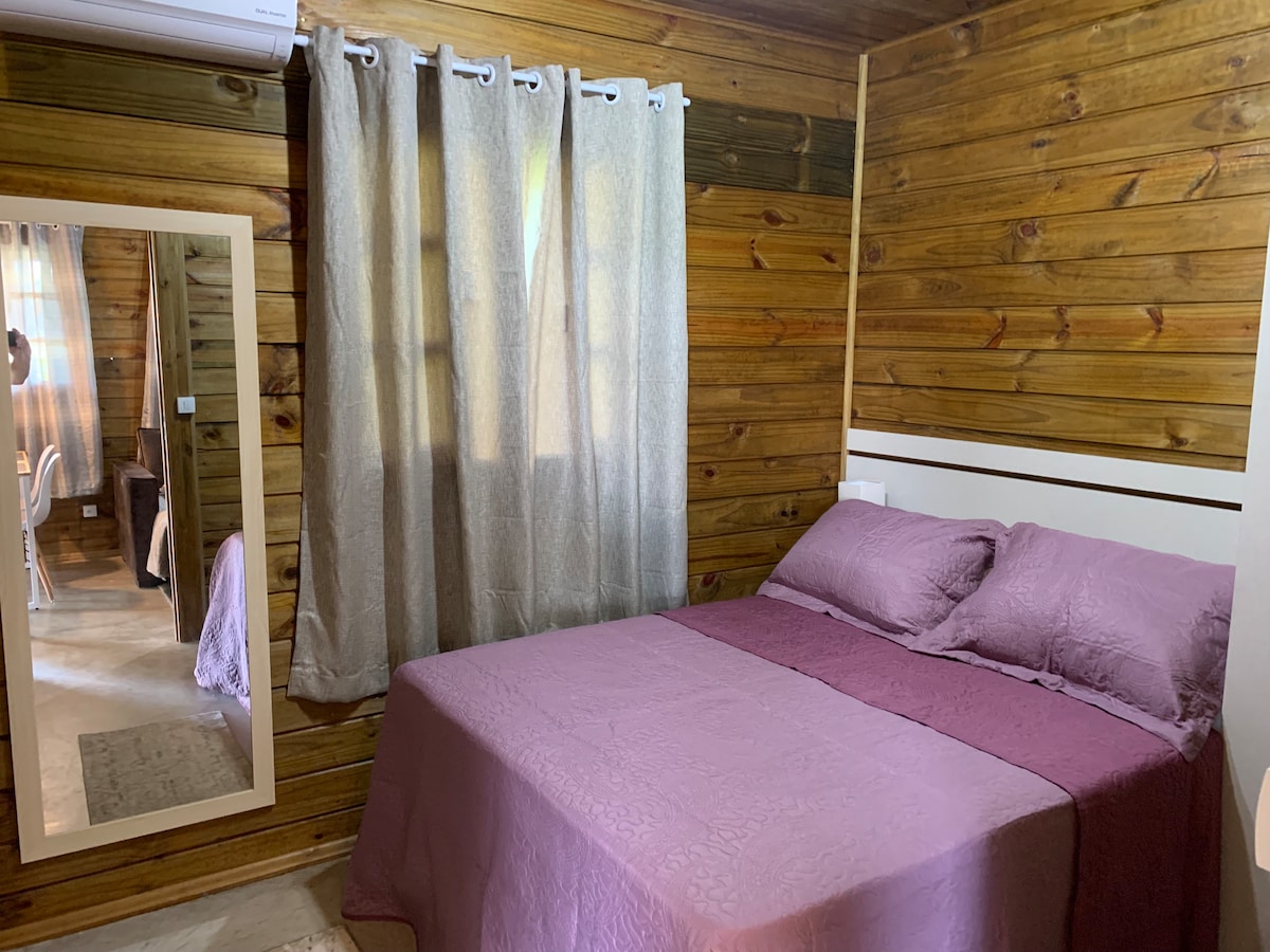 Aconchegue-se e acomode-se neste espaço rústico. Chalé - Todo equipado para casais. Banheiro com acesso pela área externa.