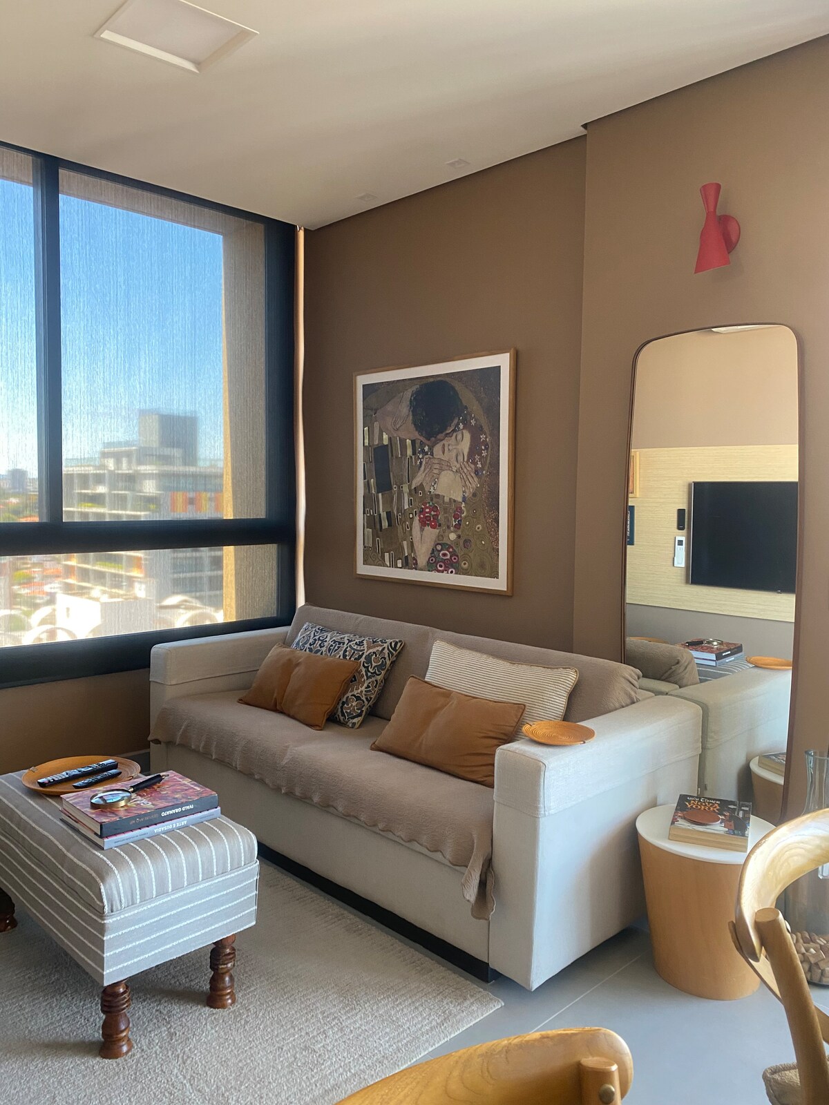 Apto tipo estudio com os ambientes separados. Um quarto com armário embutido e mesa para home office, 2 TVs (sala e quarto), Net Combo com mais de 200 canais HD e Wi-Fi de alta velocidade. Há ventiladores de piso em todos os ambientes além de microondas, airfryer, fogão, geladeira duplex e todos os utensílios de cozinha. O banheiro é privativo com box de vidro. Possui máquina de lavar roupa. Meu apto não possui vaga de garagem, porém, indico uma moradora que costuma locar dentro do prédio