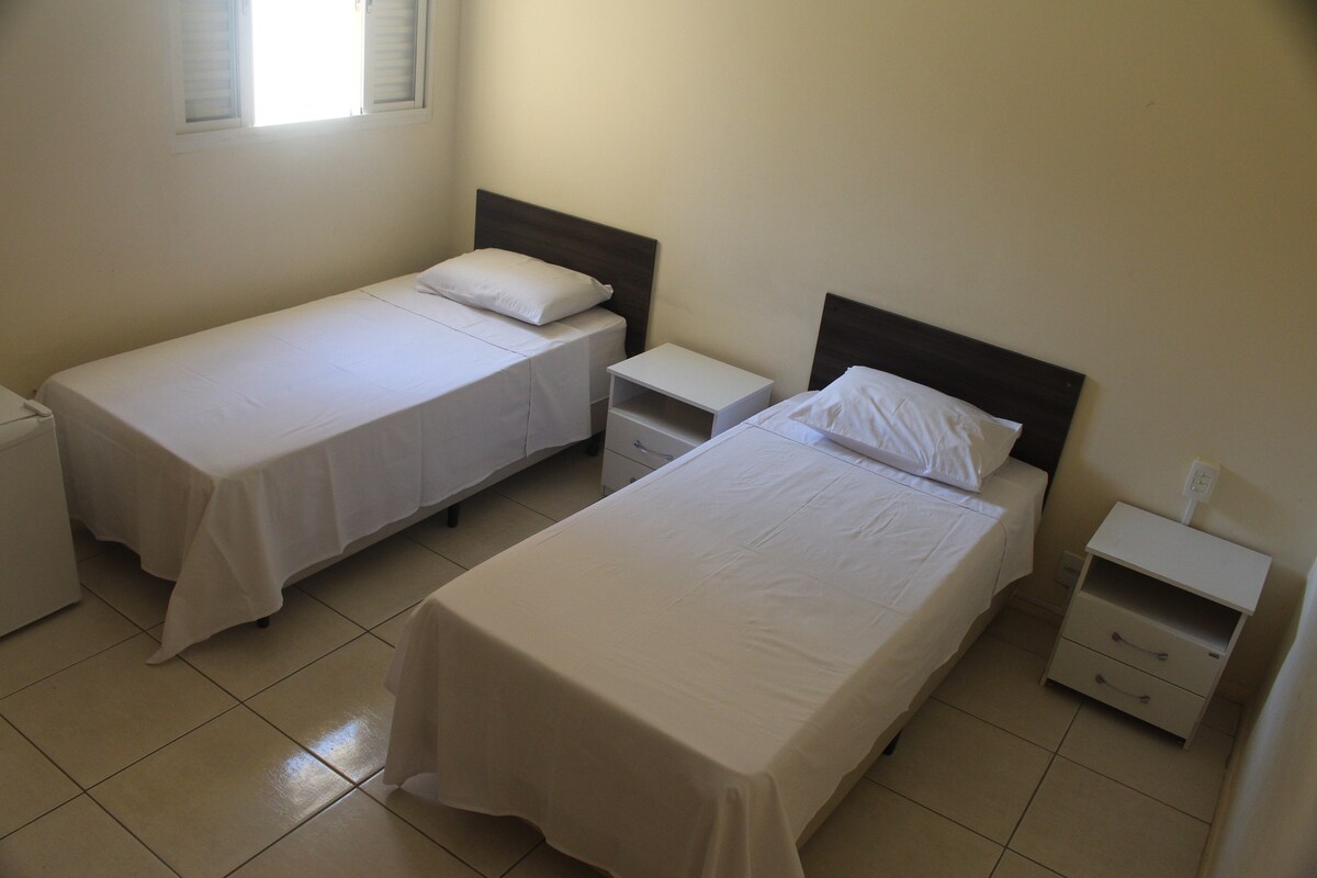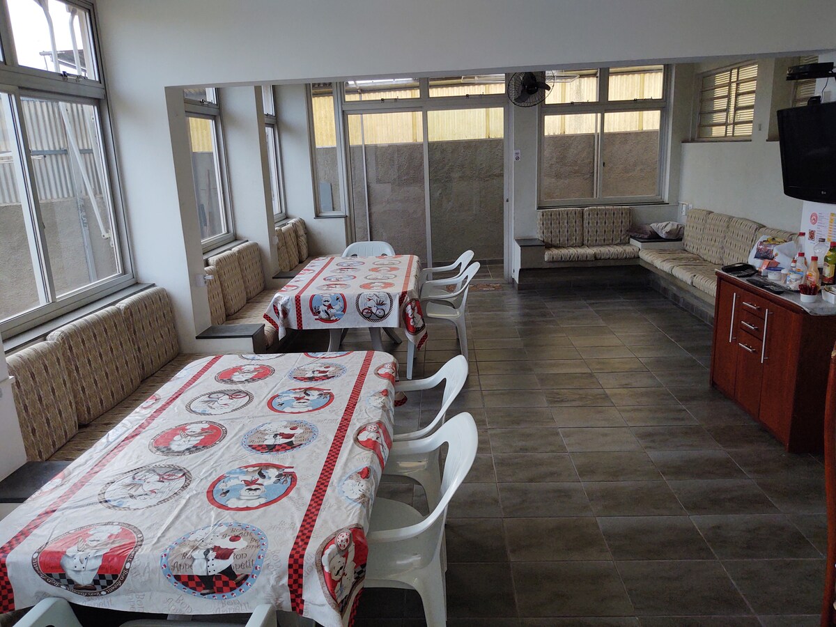 Ambiente familiar e aconchegante Entrada independente da casa principal. Montarmos uma hospedaria c/ 3 suítes, para até 7 pessoas. Disponibilizadas conforme reserva: até 3 hospedes: 1 suite de 4 a 7 hospedes: 2 suites Dessa forma há possibilidade de locação por 2 grupos diferentes no mesmo período Wi-fi, TV Box, ar cond. Temos roupa de cama, travesseiro. Trazer cobertor e toalha de banho. Deve trazer coisas de uso pessoal (escova, sabonete) Garagem se disponível 15 reais/noite.