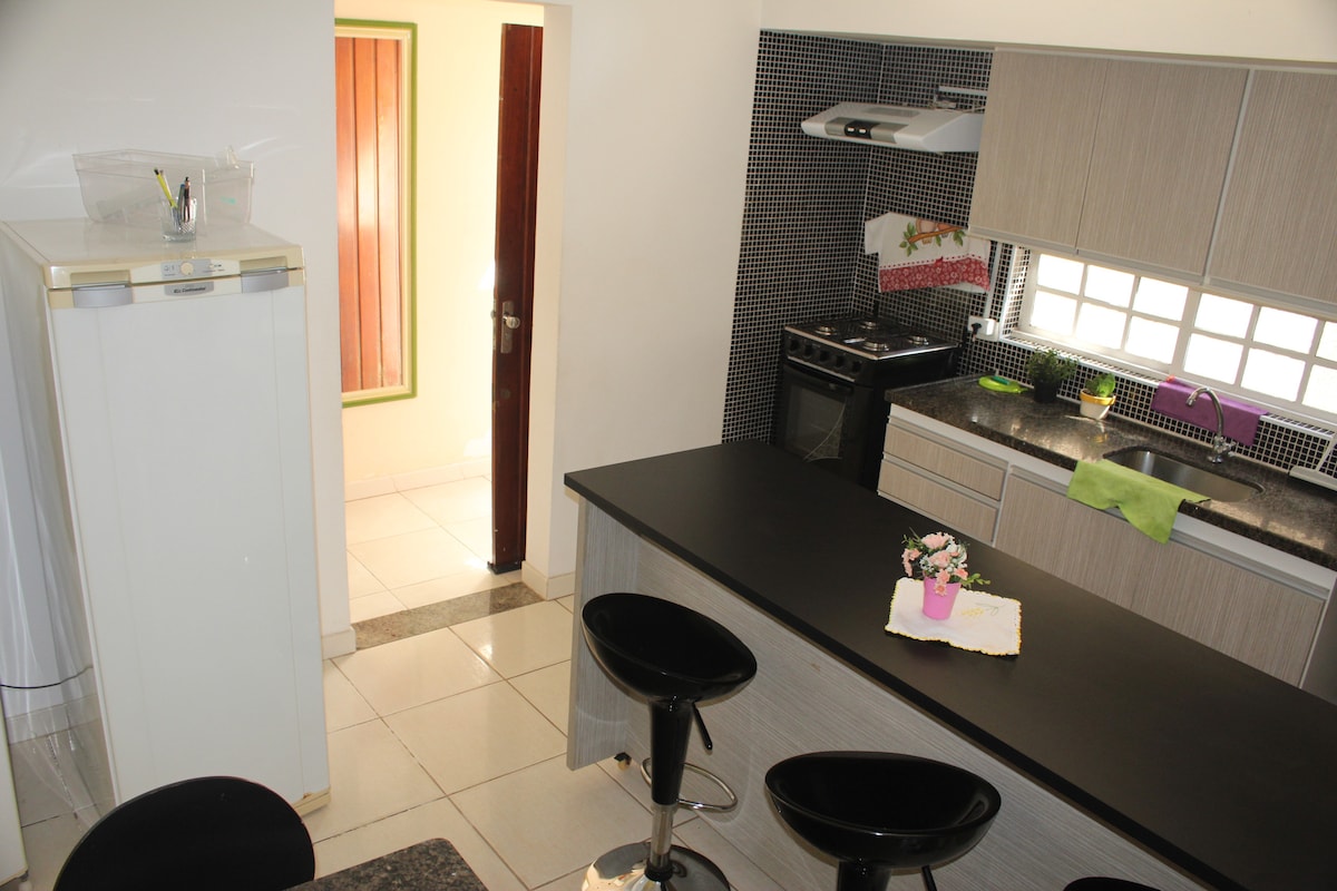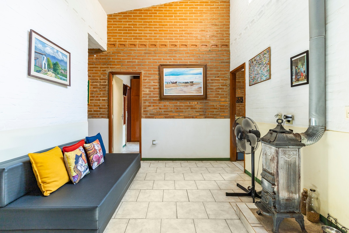 Aconchegante e confortável casa de tijolinho à vista! 3 ambientes , sala, cozinha, quarto e 1 banheiro! Oferecemos uma linda edícula com balcāo dividindo a cozinha da sala, tv de tela plana, geladeira, fogāo e microondas, além de um confortável sofá articulado.