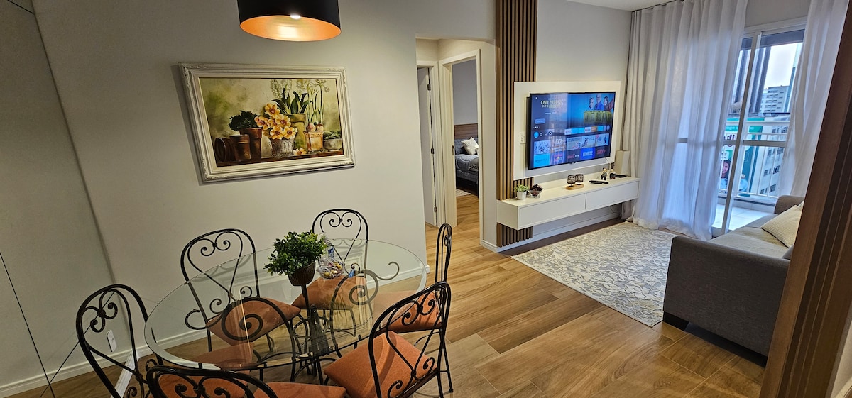 Nesse apto você estará confortavelmente instalado, pode estar certo. Ele oferece tudo o que você precisa para o seu dia a dia - Mesa de trabalho, Internet VIVO FIBRA de 240 Mb, TV Smart de 32', janela imensa com vista sensacional, roupas de cama e banho novas e macias, cozinha equipada e muito mais. A lavanderia é self-service, portaria 24h e garagem para carros pequenos e médios. Será um prazer hospedar você!