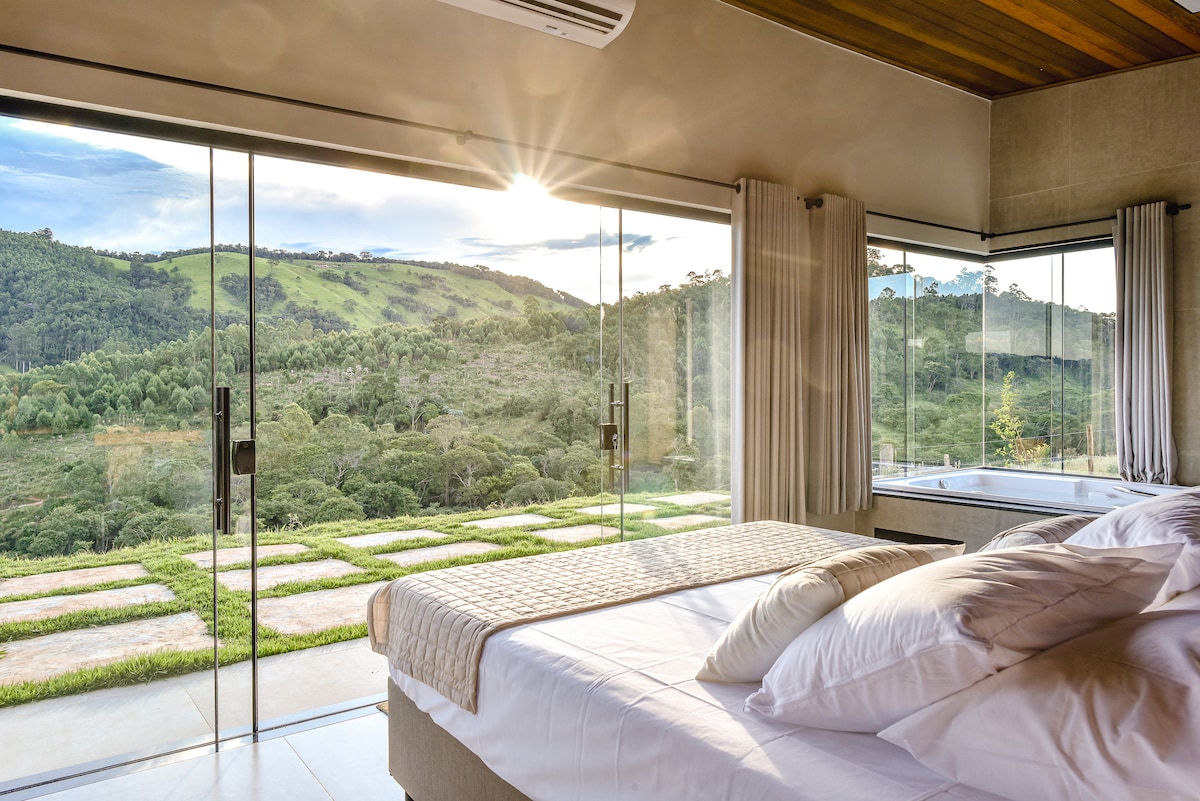 Pico360 - vista para represa, chalé vidro moderno.