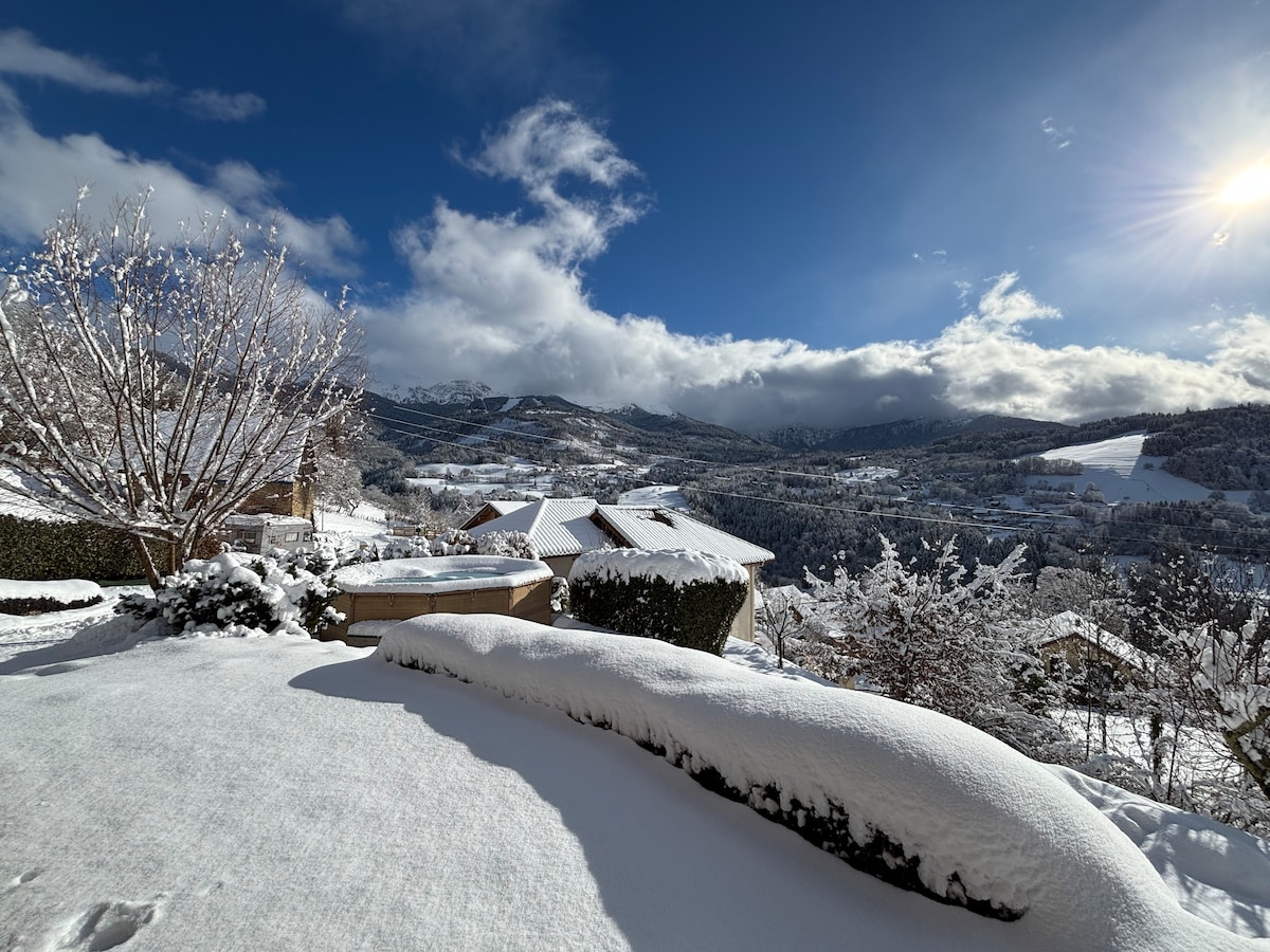 Notre petit chalet cosy avec jacuzzi vous offre un séjour détente pour 2 ou pour toute la famille. Chalet en madrier de 60 m2 construit en 2021. Vue imprenable sur Belledonne. Endroit calme avec de nombreux départs de randonnées et autre activités sportives (VTT, parapente, escalade, canyon, spéléo,ski...) Spa privé en libre accès. Chauffé toute l'année à 37°. Poêle a bois avec bûches à disposition. A 10 min en voiture de la petite station familiale du col de Marcieu. 40 min des 7 Laux.