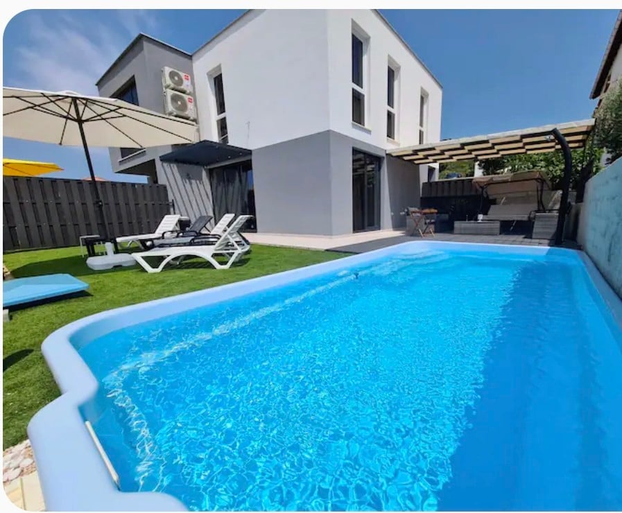 Town house with pool at great location, near city centre with all cafés and restaurants. 350 m to the Zrče shuttles. wifi and air-conditioning 2 bedrooms 2 bathrooms 2 terraces Livingroom 100 euros deposit Nice pool area is shared with 3 apartments 4 single beds 1 pull out sofa bed 4-6 people Transfers can be arranged: Call my man Teo on WhatsApp +385959034834 Zadar-Novalja 150 euro Split-Novalja 300 euro Zagreb-Novalja 450 euro