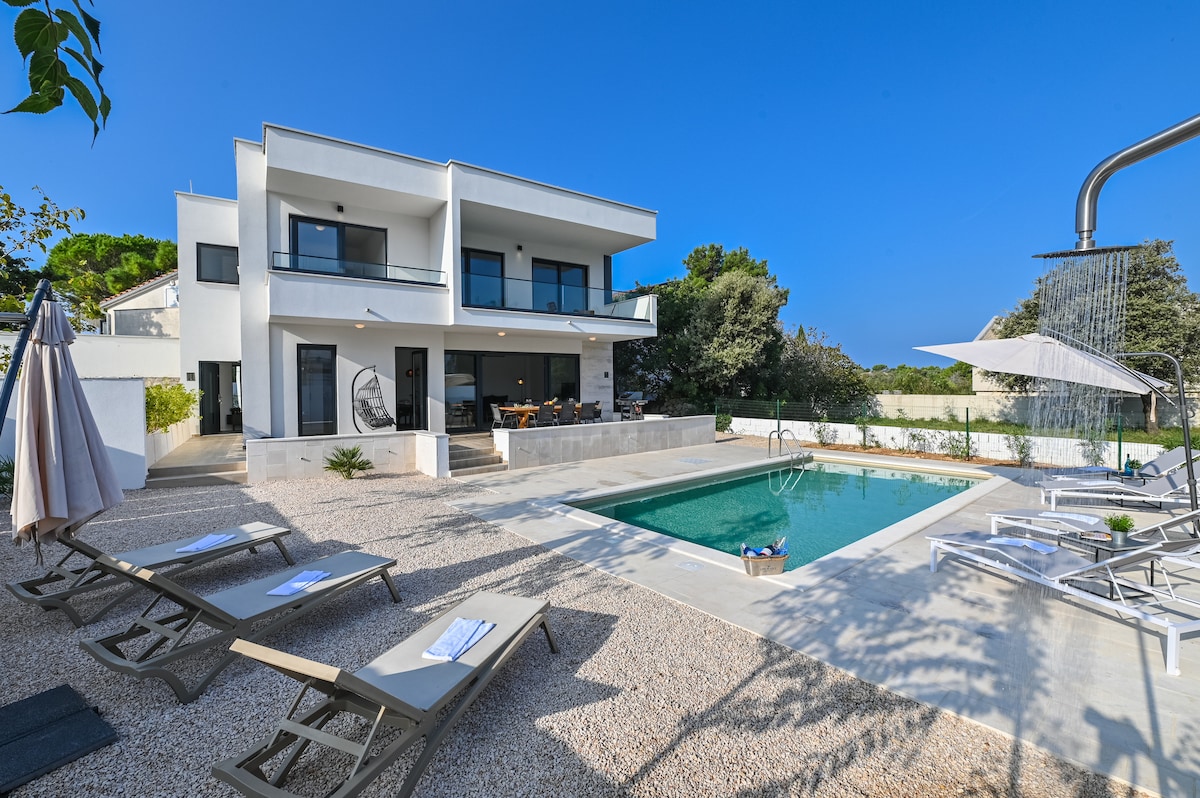 Modern brand new elegant villa located in a quiet and exclusive area of Novalja. A perfect mix of luxury, privacy, and top location.The villa features 4 bedrooms, each with a private bathroom and balcony. Spacious living room with kitchen and an additional bathroom. Covered outdoor kitchen with BBQ, dining area, private pool, private parking for 2-3 cars. Just 150 m from Beach and 200 m from town center. Surrounded by restaurants, bars, shops, and only 150 m from the bus stop to Zrće Beach.