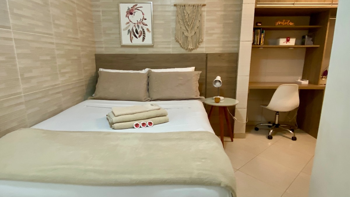 Nossa propriedade é composta por suítes que foram projetados pra receberem hóspedes que desejam um ótimo conforto por um preço justo. São suítes com banheiro, área de serviço e varanda. Uma ótima suíte para 2 a 3 pessoas. Muito bem planejado, muito bem limpo e decorado. O que vai fazer você se sentir super a vontade e com vontade de passar mais dias. Para ajudar a se proteger, sempre use o Airbnb para fazer pagamentos e se comunicar com os anfitriões. proibido fazer comida com ar ligado 500 re
