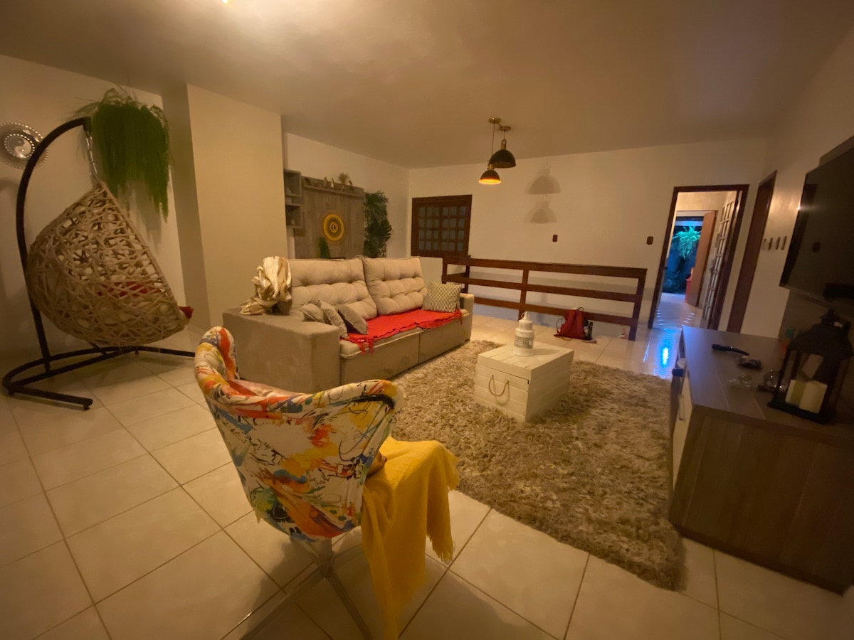 Relaxe neste espaço cheio de estilo, rústico e aconchegante. Localizado em bairro calmo e próximo a rodovia 239. Quiosque com cozinha completa, mesa de jantar, banheiro, churrasqueira e um quarto de casal. Disponibilizamos tolhas, roupas de cama, produtos básico de higiene e limpeza. Garagem fechada para dois carros, pátio fechado. O hóspede pode utilizar o pátio onde há um gramado e deck com cadeiras.
