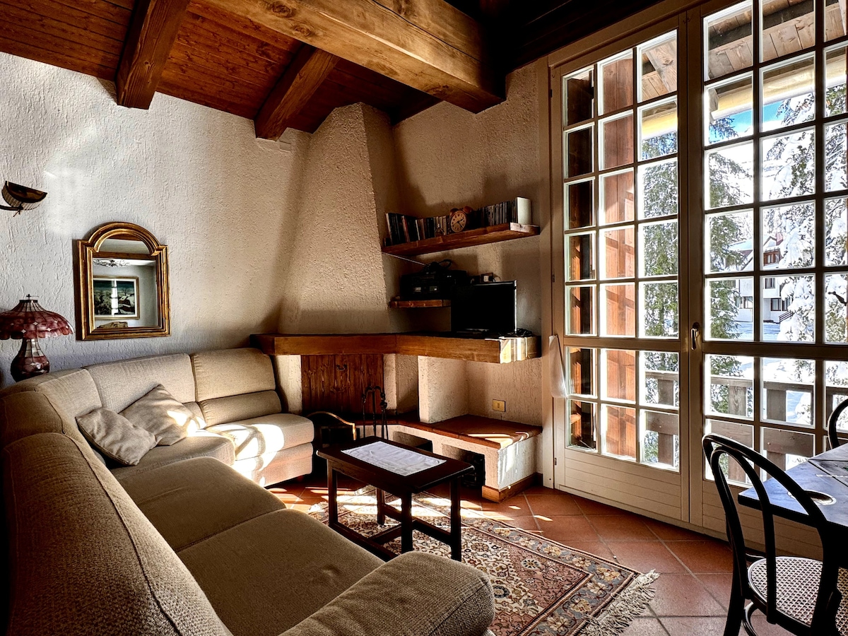 Prezioso appartamento completamente rivestito in legno intarsiato da artigiani locali. Situato a due passi dal centro di Madonna di Campiglio e dagli impianti di risalita, è perfetto per una famiglia con bambini. Due camere, una matrimoniale e una seconda camera con due letti a castello. Due bagni con doccia, di cui uno con accesso privato dalla camera matrimoniale. Disponibilità di un posto auto coperto e di deposito sci. Un fornitissimo supermercato si trova a meno di 2 minuti a piedi.