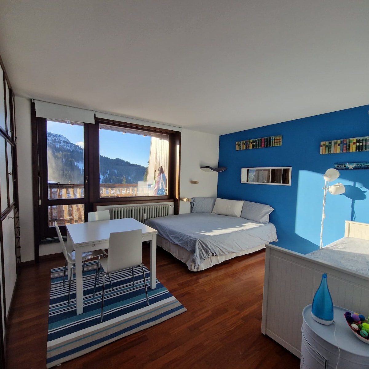 A MADONNA DI CAMPIGLIO - Frazione CAMPO CARLO MAGNO. ACCOGLIENTE MONOLOCALE con balcone e splendida vista sulle Dolomiti. Adatto per 1-2 persone. Posizione strategica: le piste da sci e da fondo sono davanti a casa. Deposito sci. scarponi e parcheggio auto condominiale sono compresi nel prezzo. Supermercato, tabacchi, scuola di sci e noleggio sci a pochi metri da casa. il centro di Madonna di Campiglio è raggiungibile a piedi, con lo ski bus (fermata a 100 metri) o in macchina in cinque minuti.