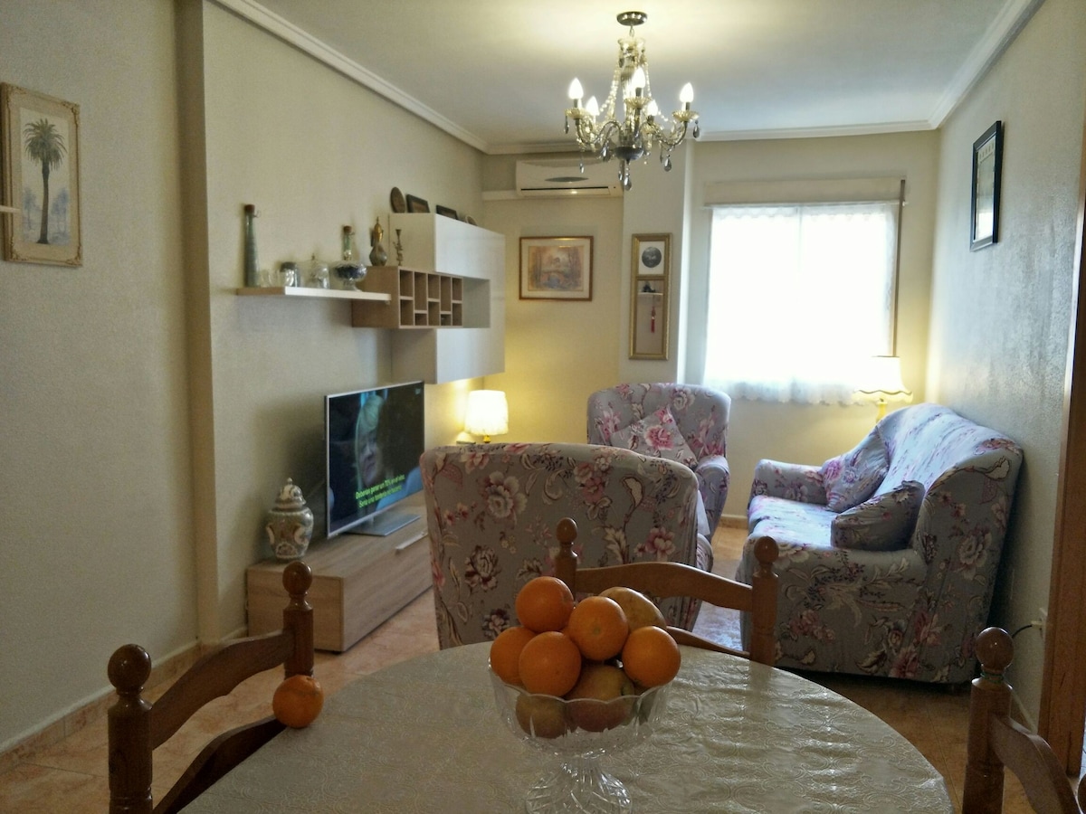 Apartamento acogedor y muy luminoso situado 7 km de las playas de Guardamar y Santa Pola, zona tranquila rodeada de naranjos, a 30 minutos del aeropuerto de Alicante. Situado en una zona tranquila donde poder relajarse y desconectar.Tiene piscina ,WIFI, cuna para bebés ,está cerca de las playas. Cerca de supermercados,bares, restaurantes. Ideal para parejas, familias (con hijos), y mascotas. Incluye cesta detalle de desayuno vegano en el precio. ( leche vegetal, café, te, pan , etc (vegano )