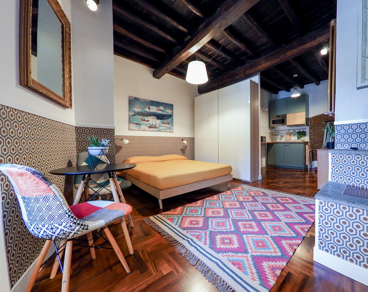 WI-FI free & cozy smart working place. Charming one bedroom apartment of about 50 sqm, located on the corner of Campo de' Fiori and on the second, top floor of an ancient palace of the 15th century, famous for having been for a century the "Inn of the Cow" owned by Vannozza, courtesan and lover of Cardinal Rodrigo Borgia. Strategic location, easy walking distance to reach the most interesting historical and culinary sites of the city center. Finely renovated, fully equipped and comfortable.