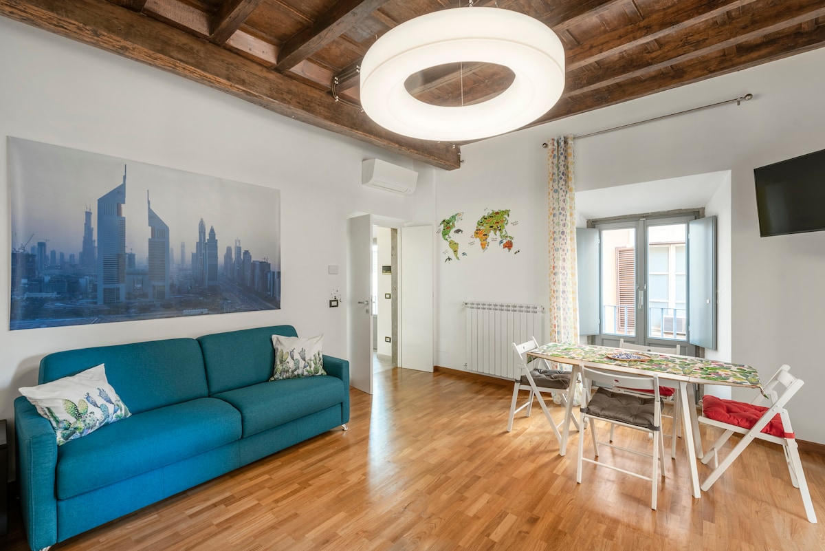 WI-FI free & cozy smart working place. Charming one bedroom apartment of about 50 sqm, located on the corner of Campo de' Fiori and on the second, top floor of an ancient palace of the 15th century, famous for having been for a century the "Inn of the Cow" owned by Vannozza, courtesan and lover of Cardinal Rodrigo Borgia. Strategic location, easy walking distance to reach the most interesting historical and culinary sites of the city center. Finely renovated, fully equipped and comfortable.