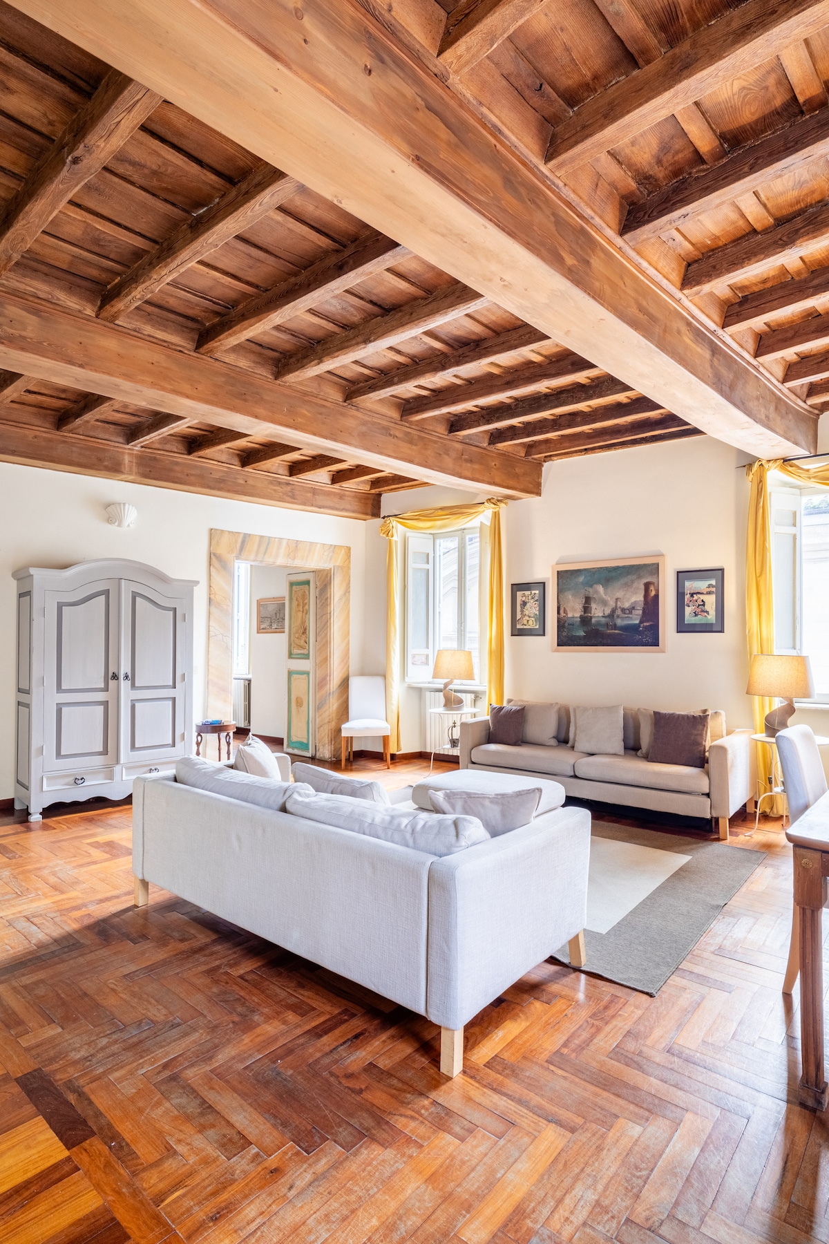 Light the large stone fire and relax with a book in this elegant home overlooking Via dei Banchi Nuovi. Coffered ceilings cap cozy rooms in relaxing, neutral tones accented by designer furnishings and owner's original paintings. This charming fully renovated house is located in one of the most beautiful, ancient and vibrant area of the center of the Eternal City. We also like to offer eco-sustainable hospitality: we use electricity from renewable sources, organic products.